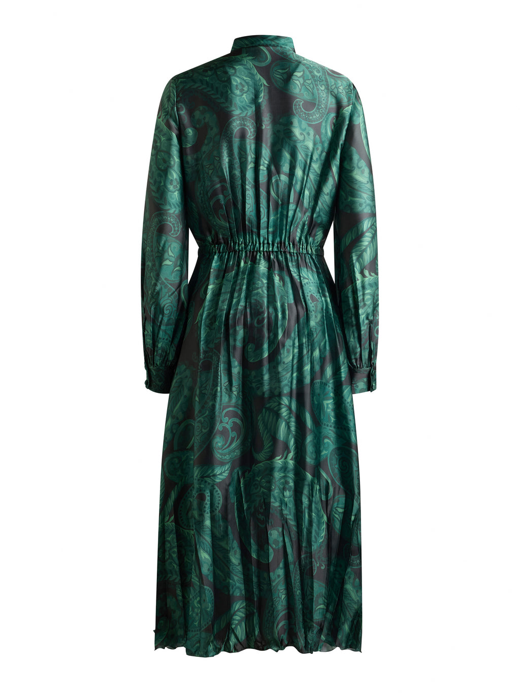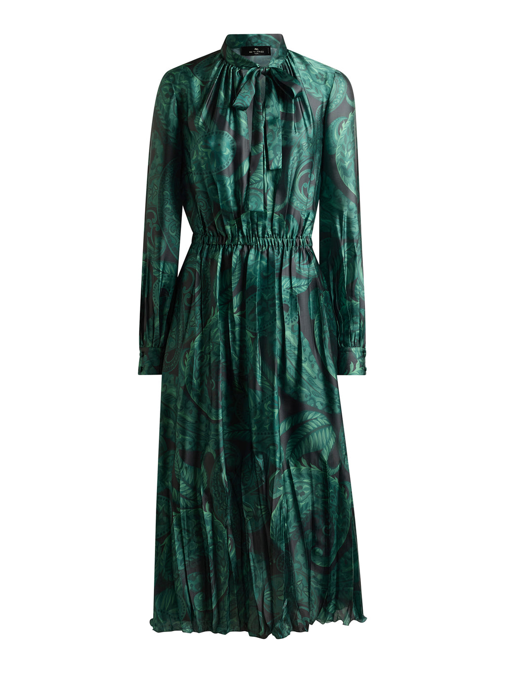 Etro’s Ruched Paisley Midi Dress captures the house’s iconic motif in deep green tones that feel grounded and refined for Fall. Cut in silk with an elegant midi length, the silhouette features a lavallière collar, long sleeves with buttoned cuffs, and a softly elastic waist that gathers into a pleated skirt. Style with tall boots for a seasonal statement, or with strappy heels for an evening look.