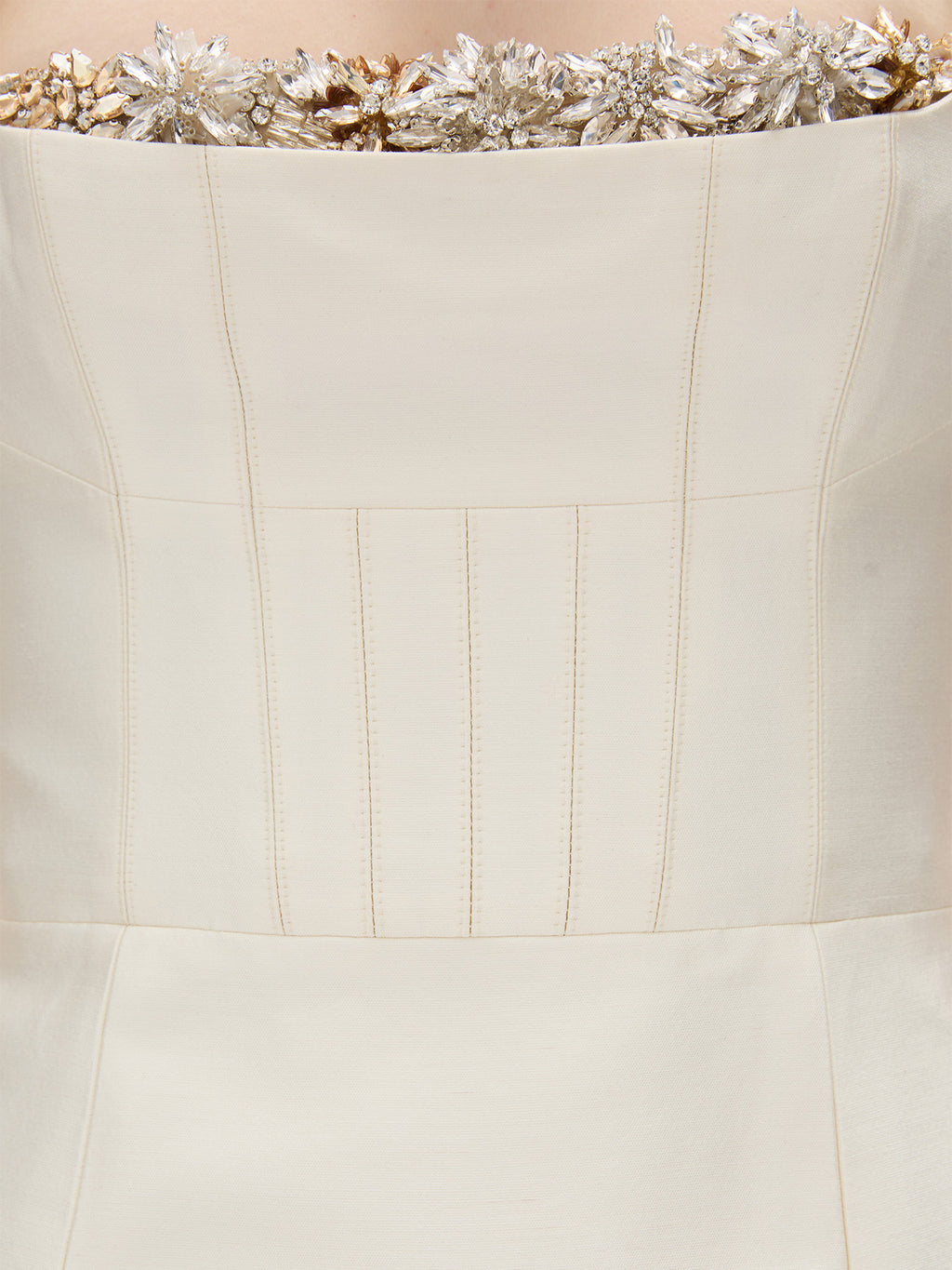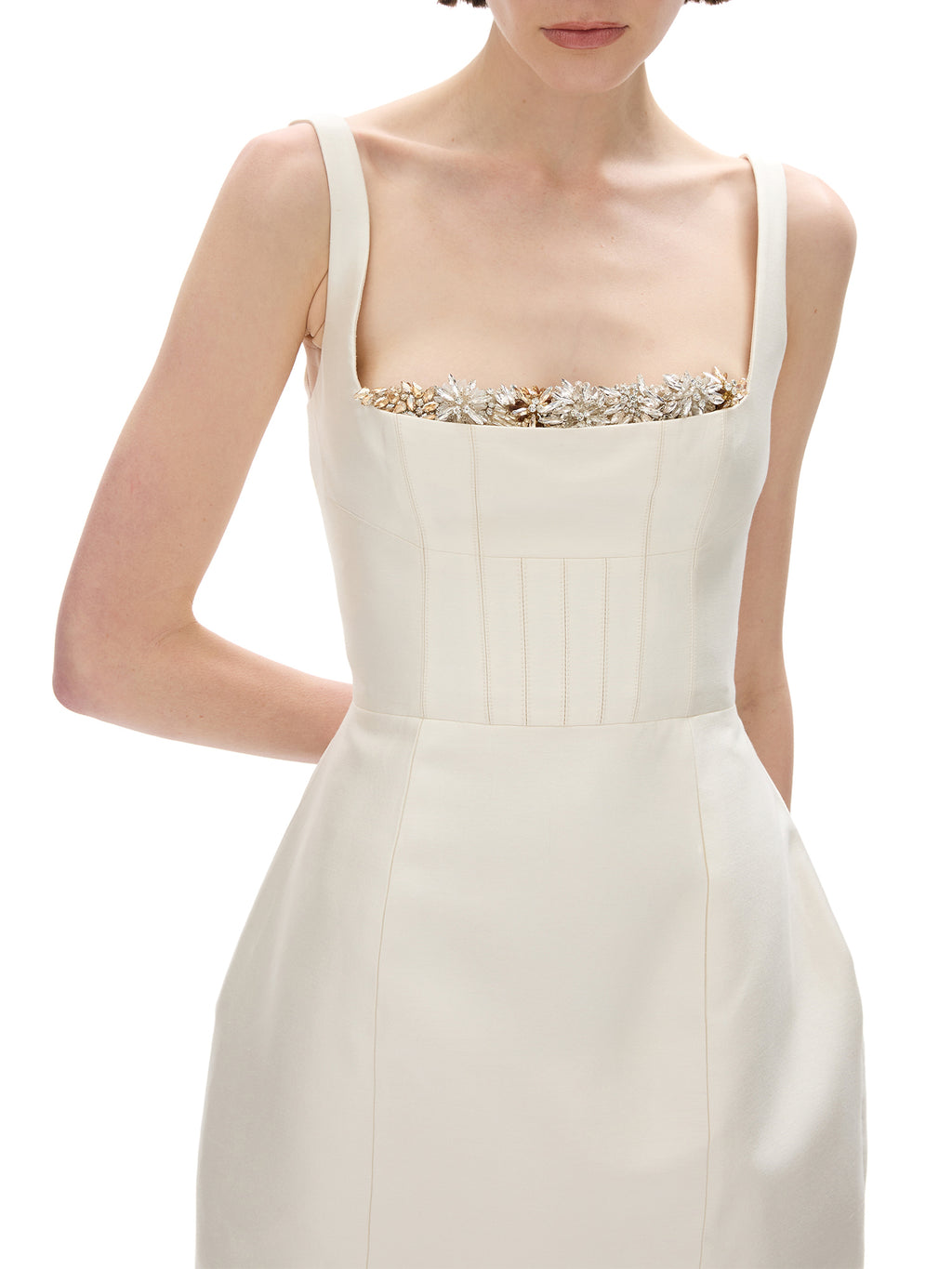 The Ludovica Trim Mini Dress by Rachel Gilbert channels modern femininity in a clean, sculpted silhouette. A square neckline and hand-placed embellished trim bring refined detail, while the boned bodice defines the waist and bust. Finished with a skirt that falls just off the body for a flattering, contemporary feel. -