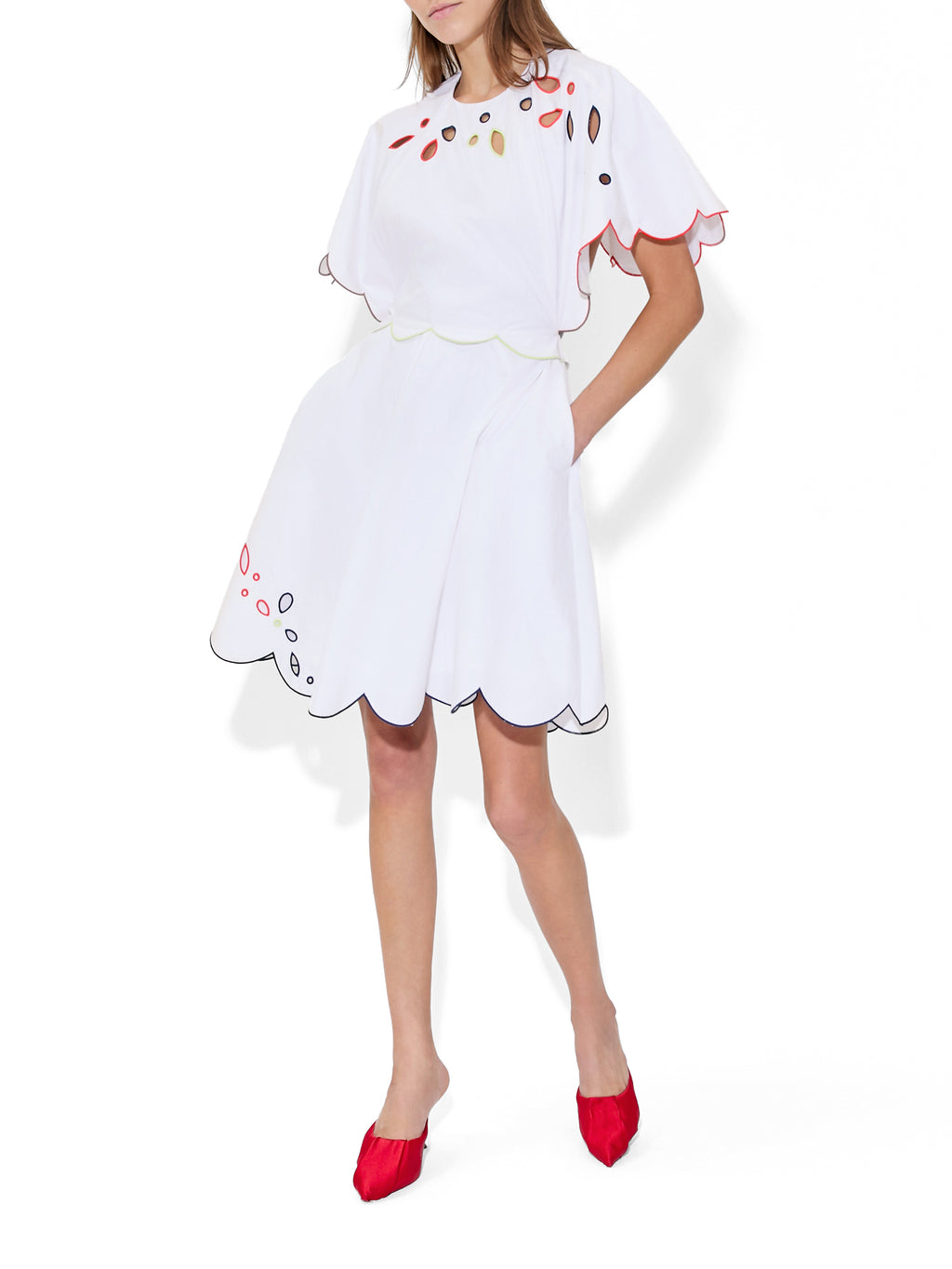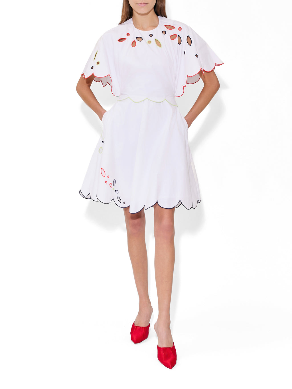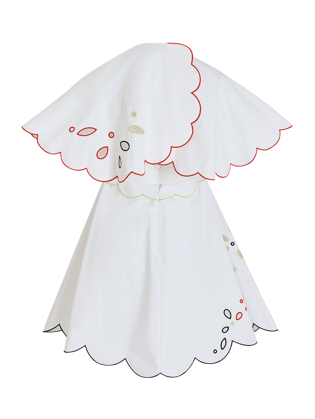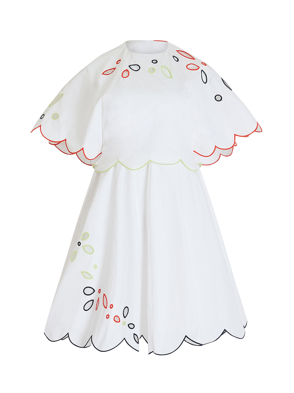 The Eyelet Cotton Poplin Scalloped Buttercup Dress by Rosie Assoulin brings playful design to life through volume and detail. A cape-like overlay and full skirt are framed by scalloped edges, while embroidered eyelet motifs in red, green, and black lend a touch of whimsy against crisp white cotton poplin. -