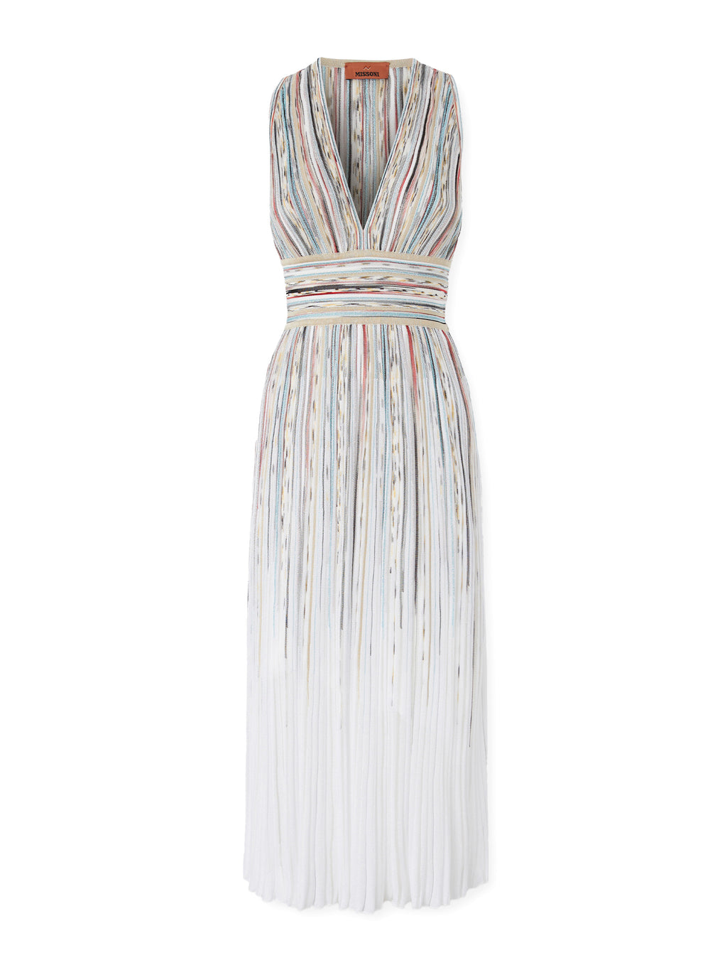 A sleeveless knit midi dress defined by a deep V neckline and Missoni’s signature vertical striping. Finely worked yarns create a softly pleated effect through the skirt, while a banded waist subtly shapes the silhouette. The elongated lines and lightness of the knit give the piece an effortless fluidity, balancing structure with ease. -