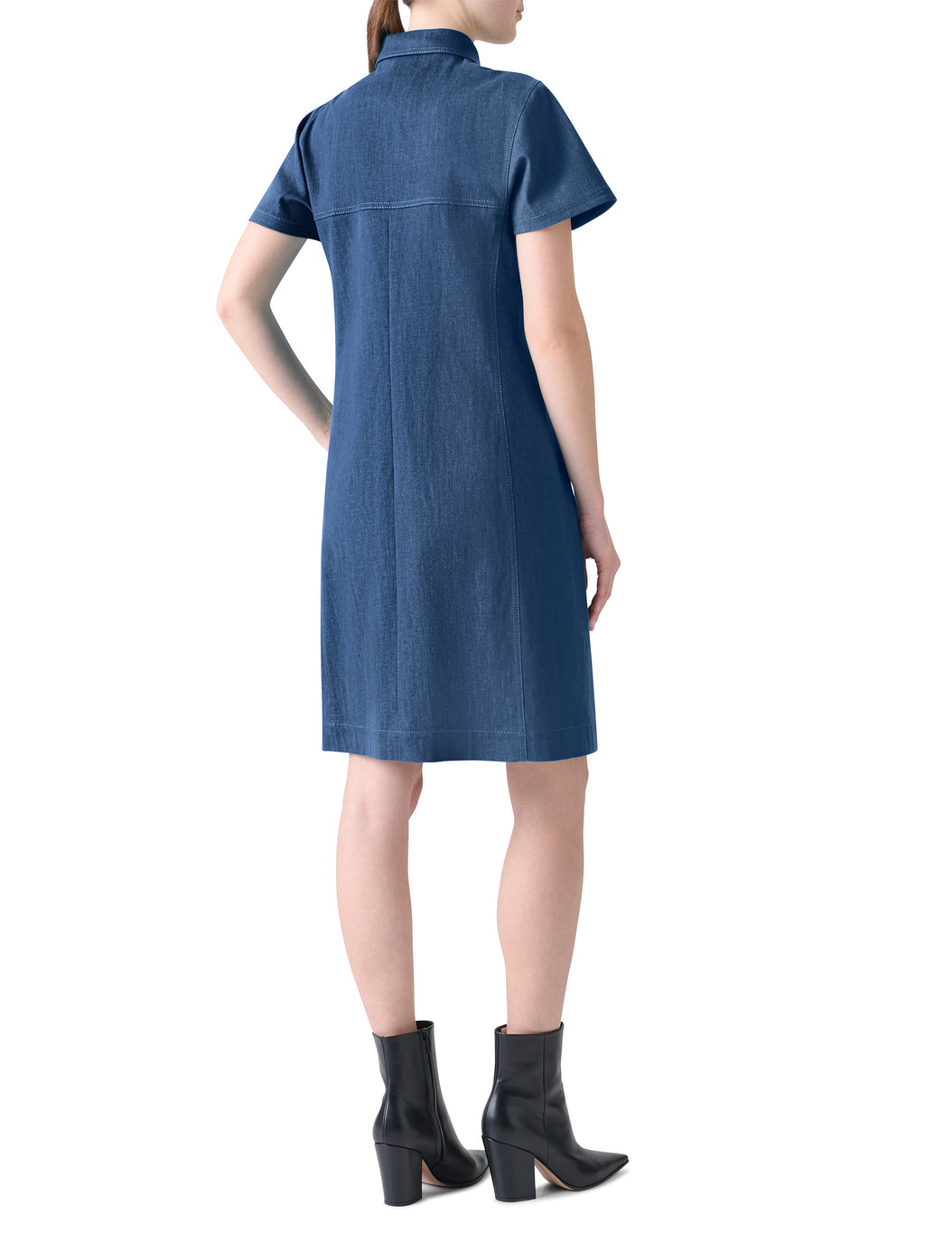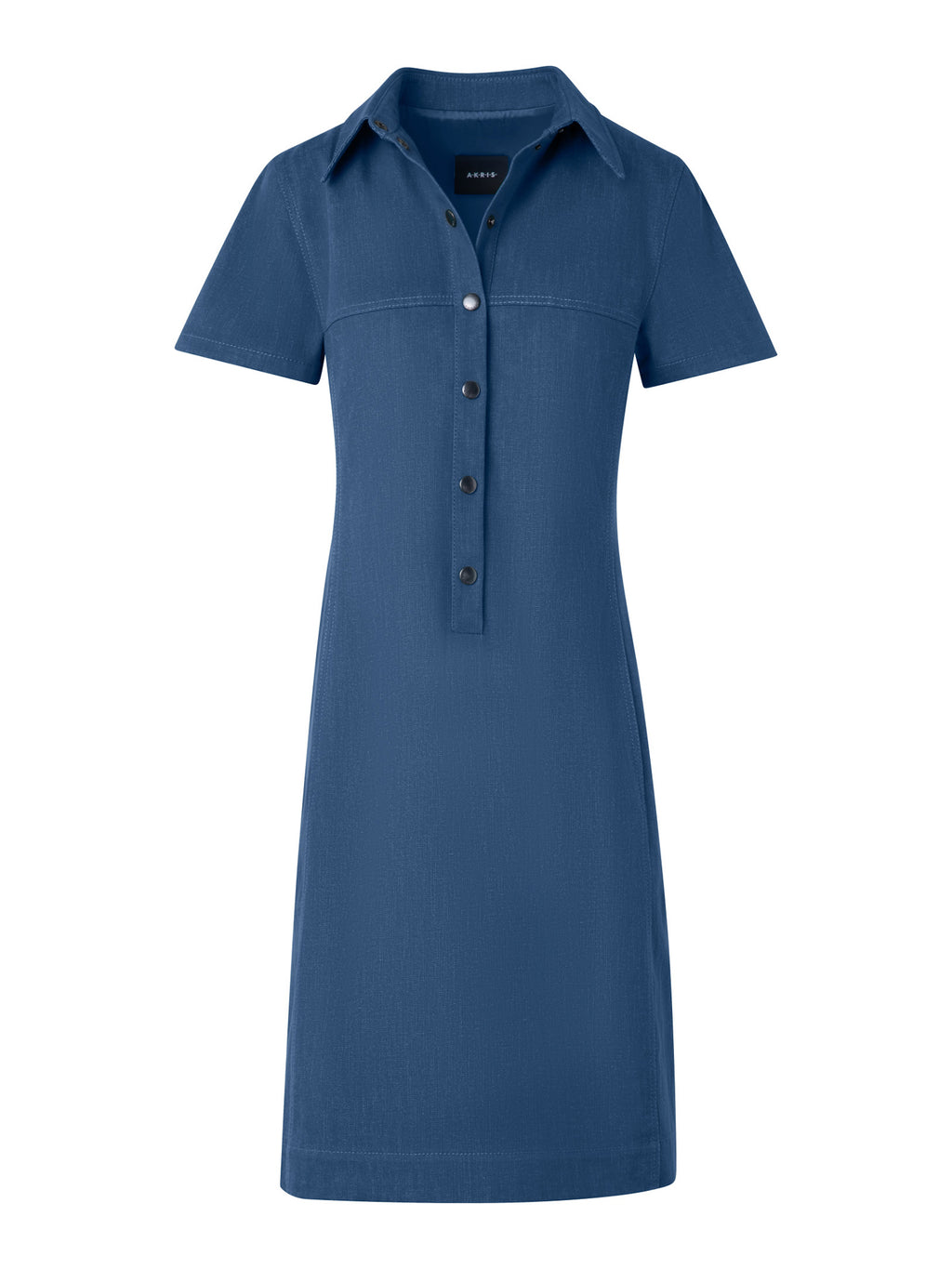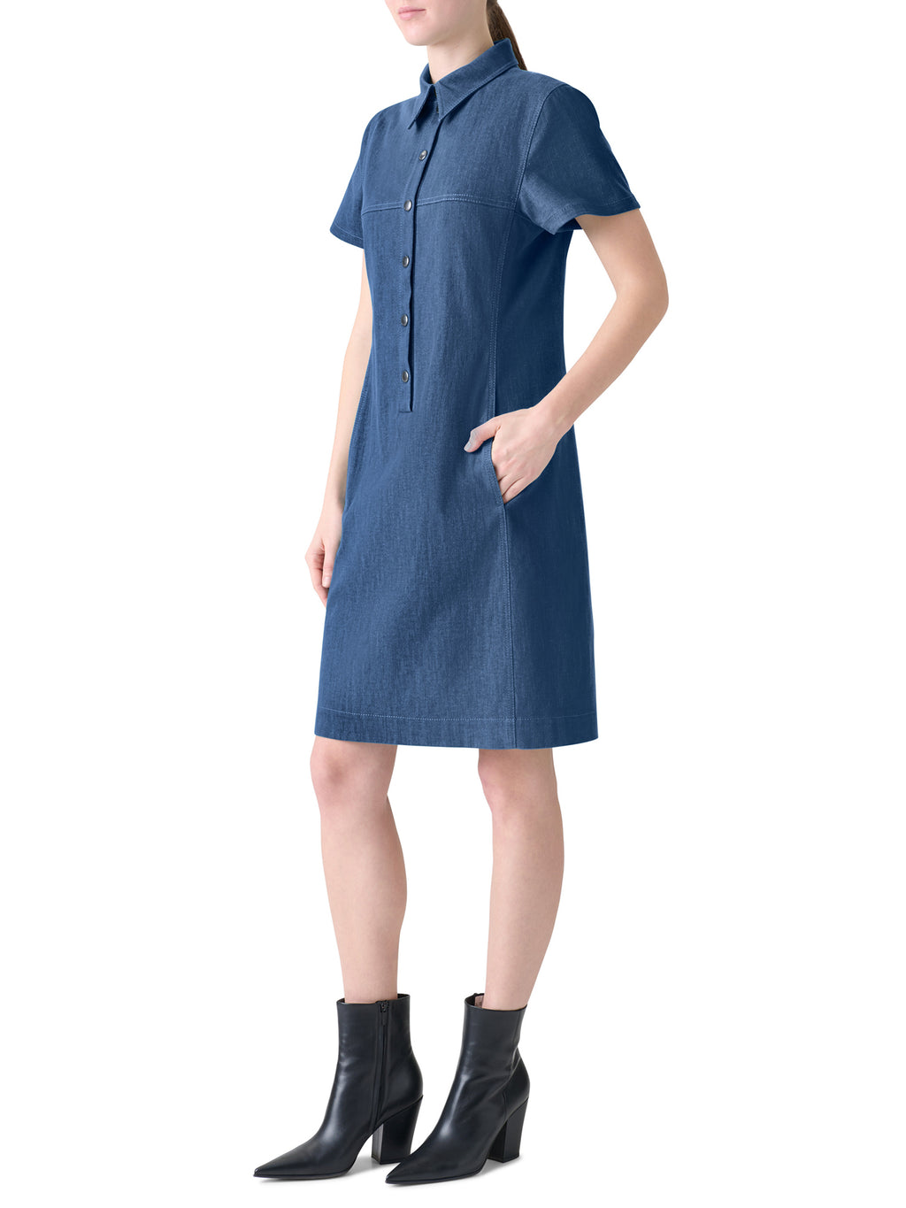 Akris’ Cotton Denim Polo Dress is crafted from stretch cotton denim, featuring a shirt collar, metal snap buttons, short sleeves, and practical pockets for an easy everyday style. -