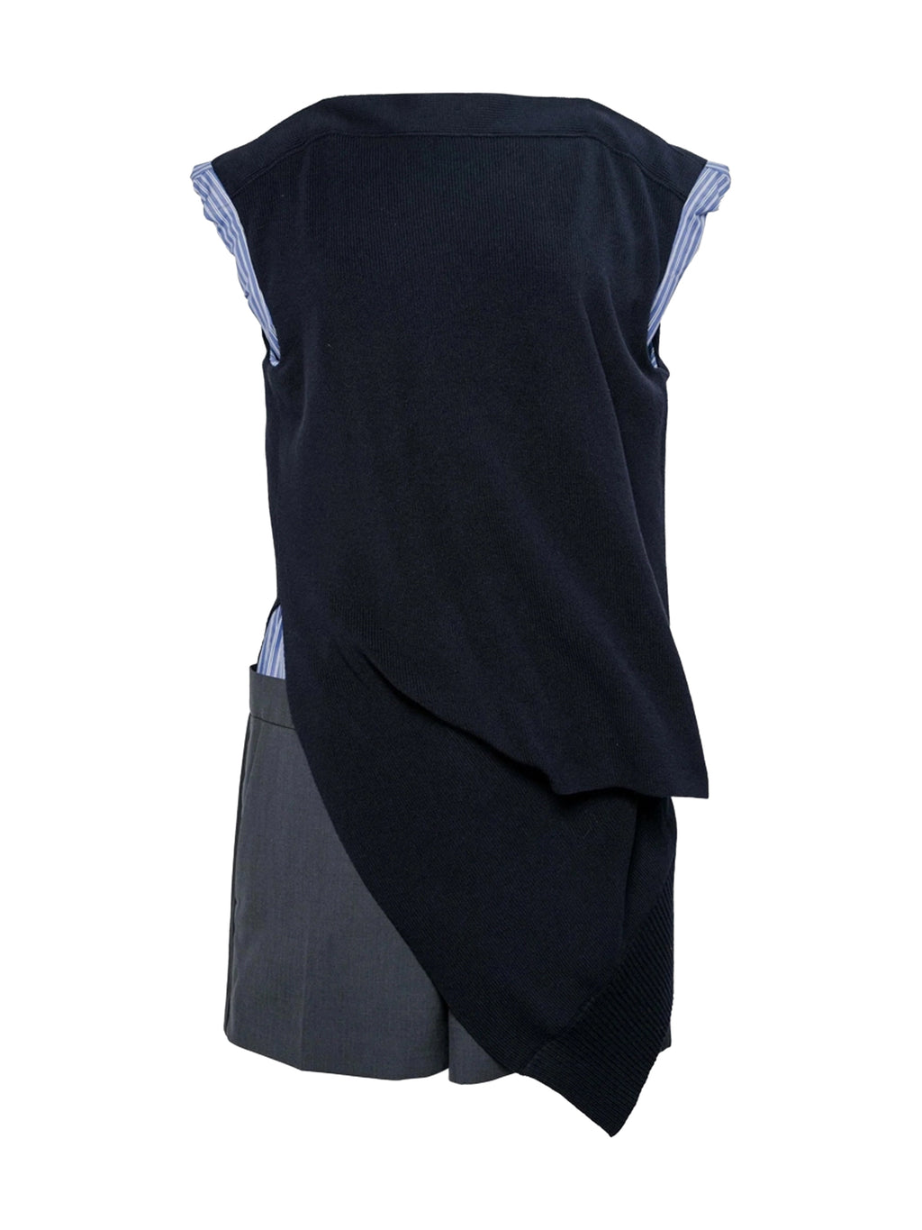 sacai's Suiting x Knit Dress highlights the brand’s signature deconstructed aesthetic through a layered, hybrid design. A clean boat neckline is paired with a contrast shirting underlayer, while a knitted, draped overlay creates fluid movement and asymmetrical interest. Effortlessly blending tailoring and knitwear, this piece delivers sacai’s modern, architectural approach to everyday dressing.