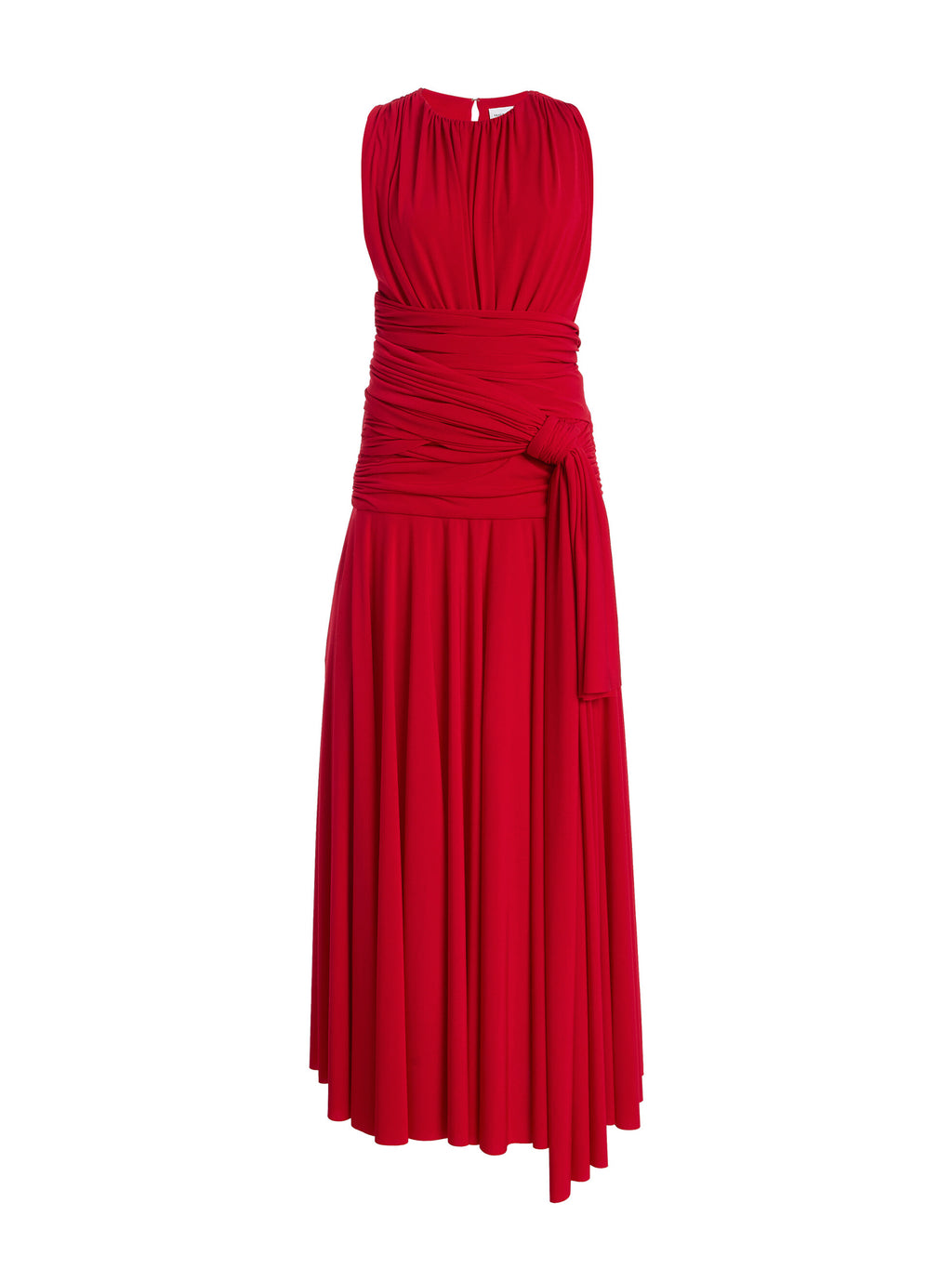 Brandon Maxwell’s Isadora Dress, seen on the Spring 2026 runway, embodies elegance with a striking, modern sensibility. Cut from soft stretch jersey in a vivid red hue, the silhouette is shaped by gentle gathering through the bodice. A sculptural wrap detail defines the waist, lending structure and intention while allowing the skirt to flow effortlessly. Bold yet refined, it captures the collection’s balance of drama and restraint. -
