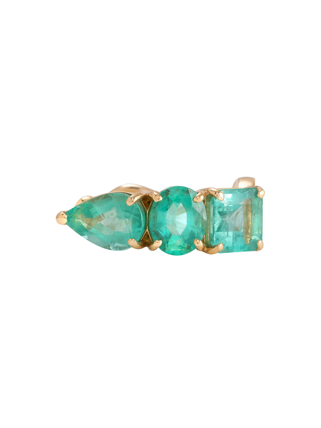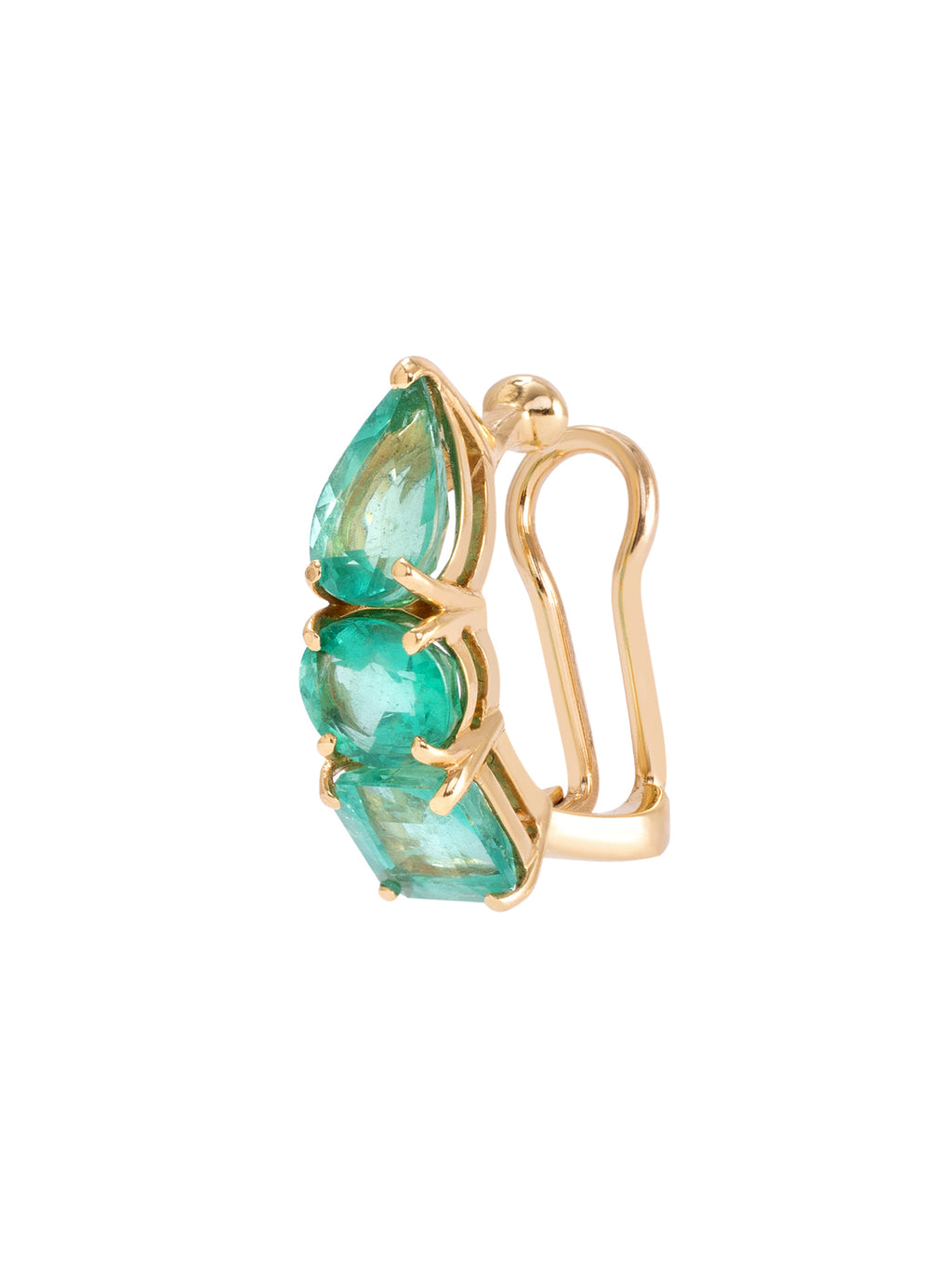 The Cushion and Pear Emerald Piercing by Giovana Brait is a single 18k yellow gold earring featuring three vibrant emeralds in different cuts. A striking addition to any earscape. This piece is ineligible for promotional discount. -