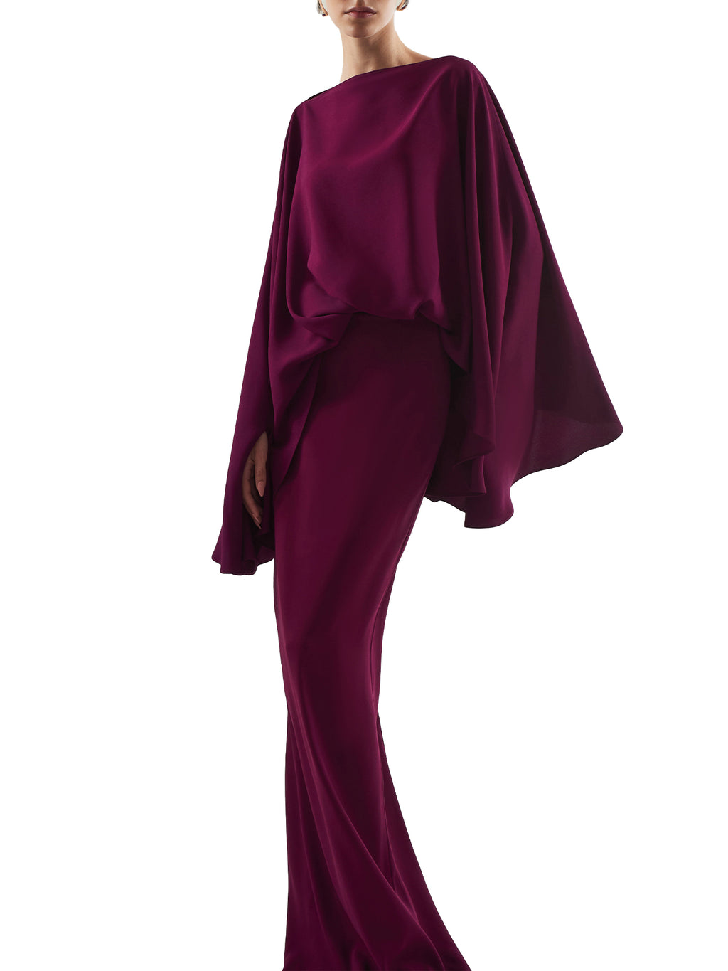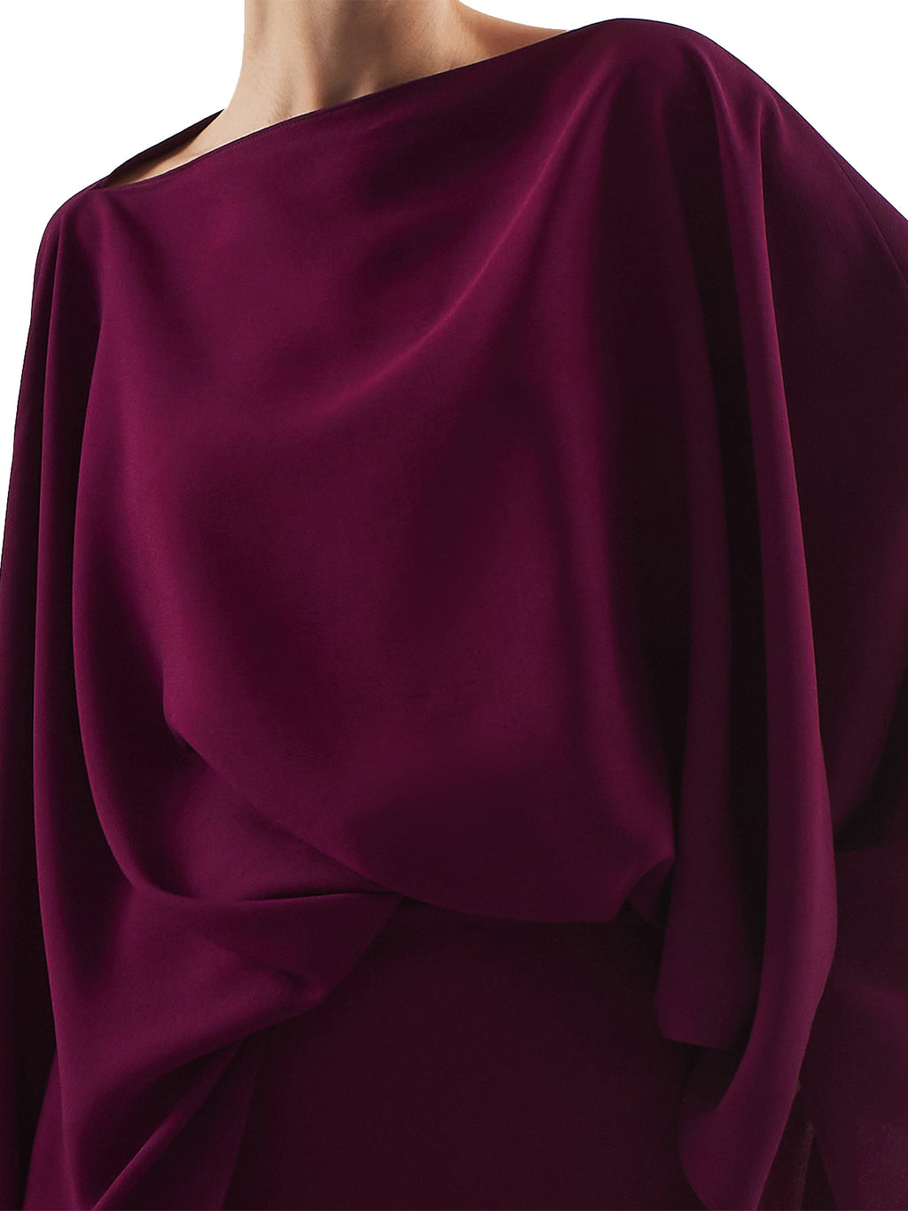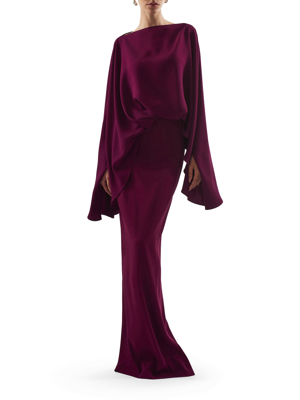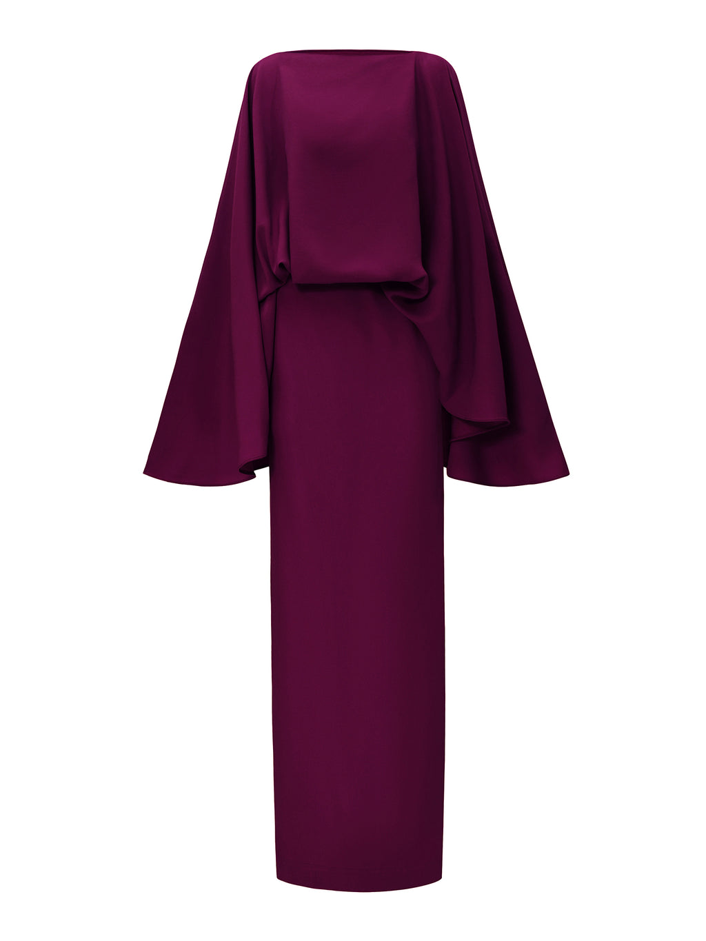 The Eolia Dress by Taller Marmo is crafted from crepe cady in a rich plum hue. Designed with an elegant boatneck and dramatic flared sleeves, it features a relaxed blouson bodice that cinches at the waist before falling into a sleek column silhouette. -