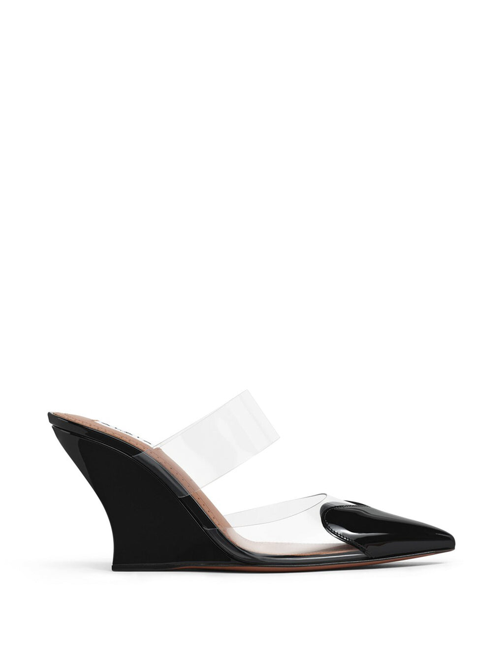 Alaïa’s Le Cœur Wedge Mules feature the signature heart cut at the front, crafted in patent leather with transparent polyurethane. Their sculptural silhouette offers a modern, statement-making choice for evening dressing. -