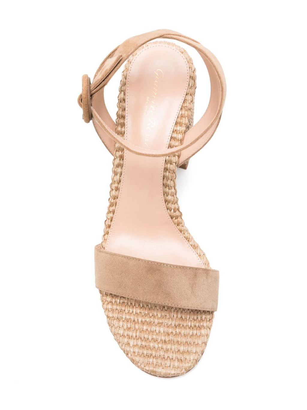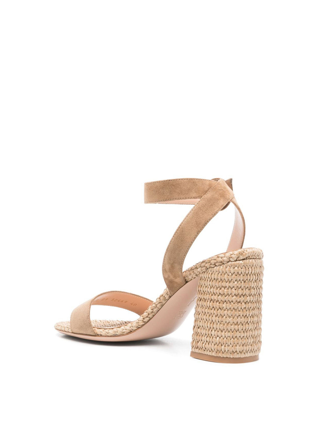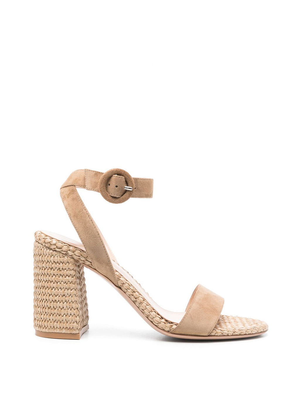 The Luana Sandals by Gianvito Rossi blend the elegance of suede with the natural texture of raffia for a refined take on the classic espadrille. Designed with an open toe and an adjustable ankle strap, they sit atop an 85 mm covered block heel for a balanced lift. Crafted in Italy with a leather outsole, this pair offers effortless sophistication for warm-weather styling. -