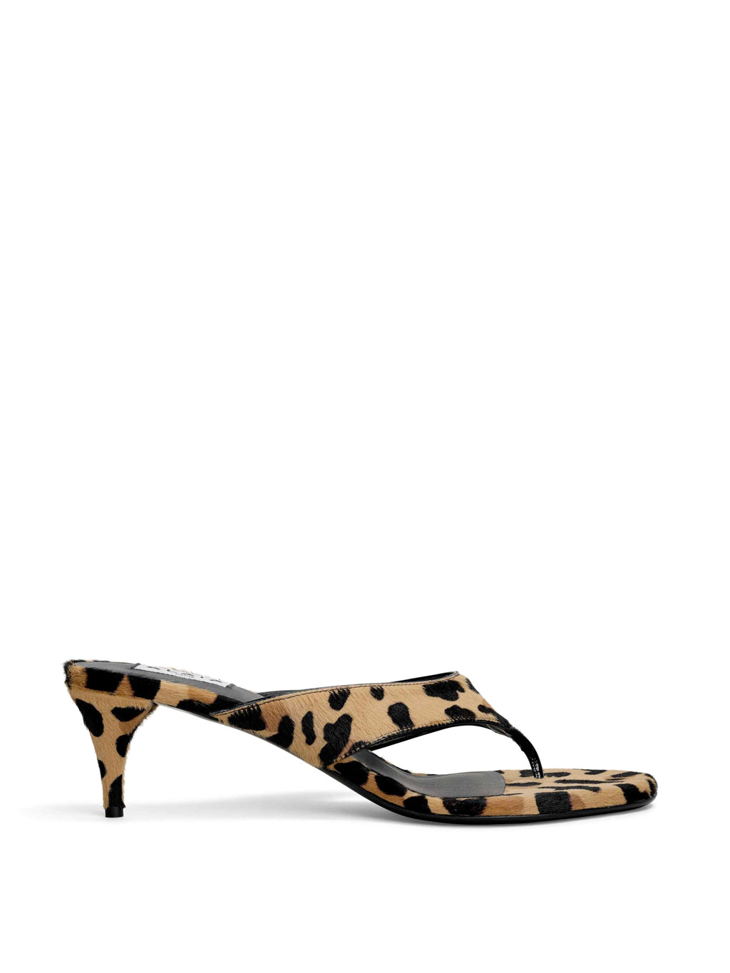 The Leopard Haircalf Infradito Thong Mules by Alaïa are crafted from pony haircalf leather in a bold leopard print. Designed with a sleek thong silhouette and heel, they feature a matching leather insole for a seamless finish.