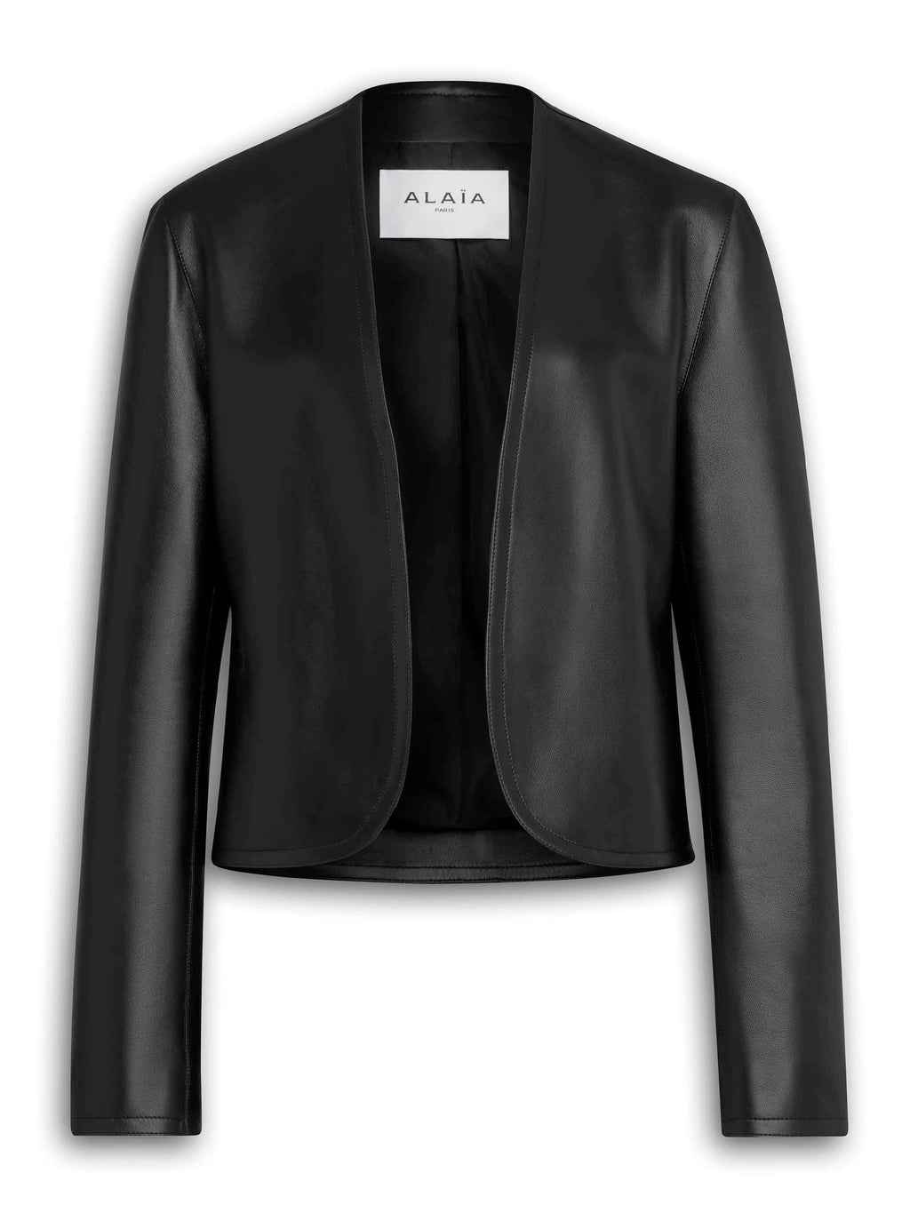 The Round Leather Collarless Blazer by Alaïa is crafted from supple lambskin leather with a clean, open-front design. Featuring long sleeves and a cropped length, its rounded hemline and tailored fit offer a modern, streamlined silhouette. -