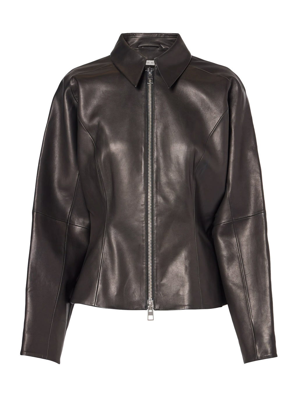 The Fitted Leather Jacket by The Sei sculpts an hourglass silhouette in soft lambskin. Featuring a structured collar and relaxed sleeves, it blends sleek tailoring with a sculptural edge. -