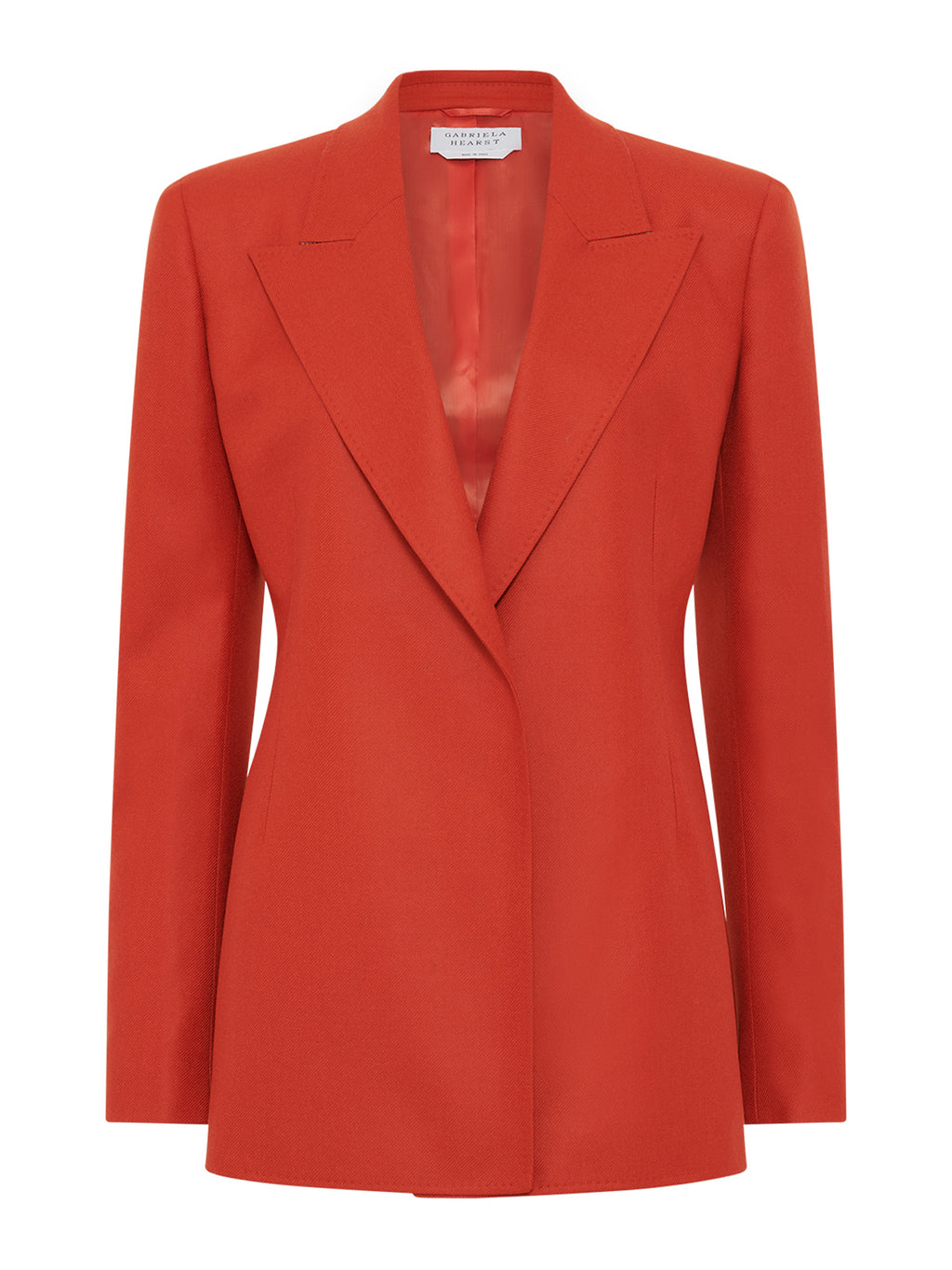 Gabriela Hearst’s Mairi Blazer is crafted in antelope orange wool-cashmere flannel with a structured silhouette, strong shoulders, and a slim, open body. Its clean, closure-free design reflects the Fall ’25 collection’s pigment-inspired palette. Style with the coordinating Cruz Shirt and Rhein Pants for a striking tonal look.