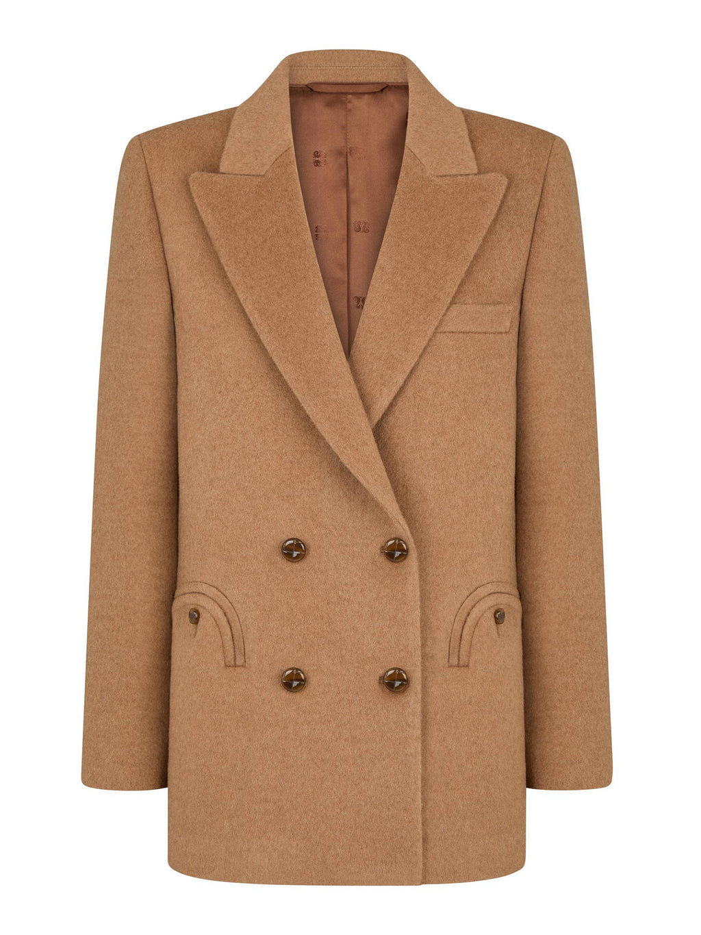 Blazé Milano’s Mylius Everynight Blazer embodies the sophistication of the Milanese woman at home in her city. Rendered in warm camel, this oversized double-breasted blazer reinterprets a timeless classic with bold, masculine undertones—structured peak lapels, padded shoulders, and a boxy silhouette. The brand’s signature Smiley pockets add a playful touch, while tortoiseshell-effect buttons and a chocolate logo-lined interior bring depth and polish. -