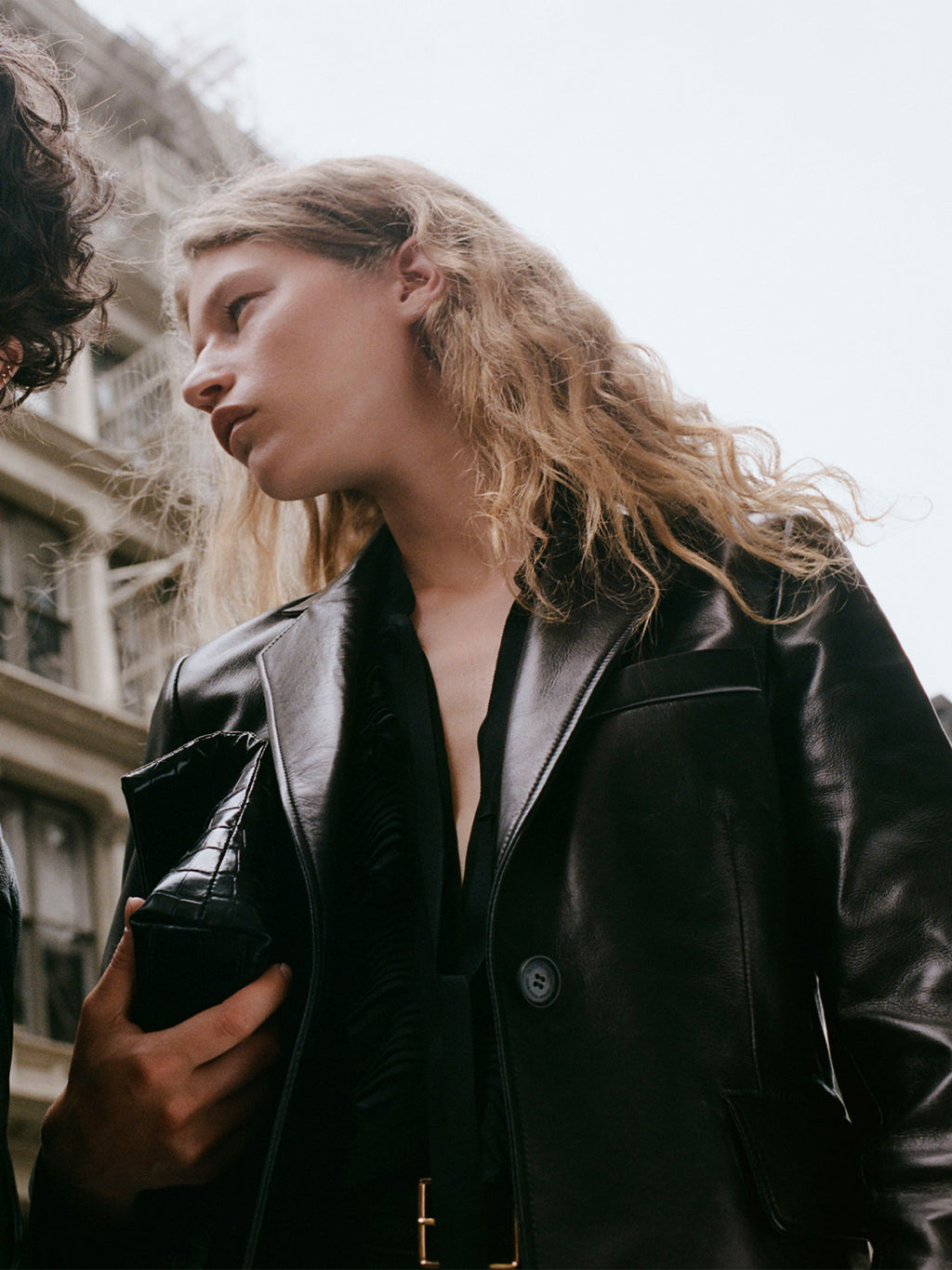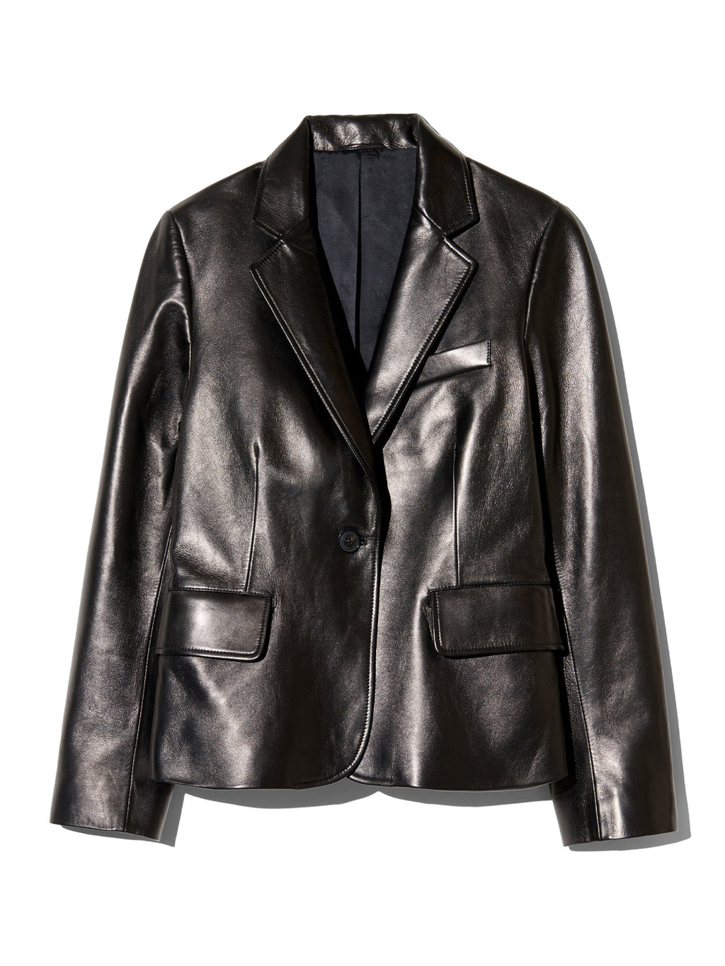 The Pascale Leather Jacket by Nili Lotan is a shrunken, cropped lambskin jacket designed with bracelet-length sleeves, a single horn button at the front, and besom buttonholes at the lapel and cuffs. Soft shoulder pads and sleeve heads enhance the shape, with darts at the waist and a back vent for a tailored finish. -