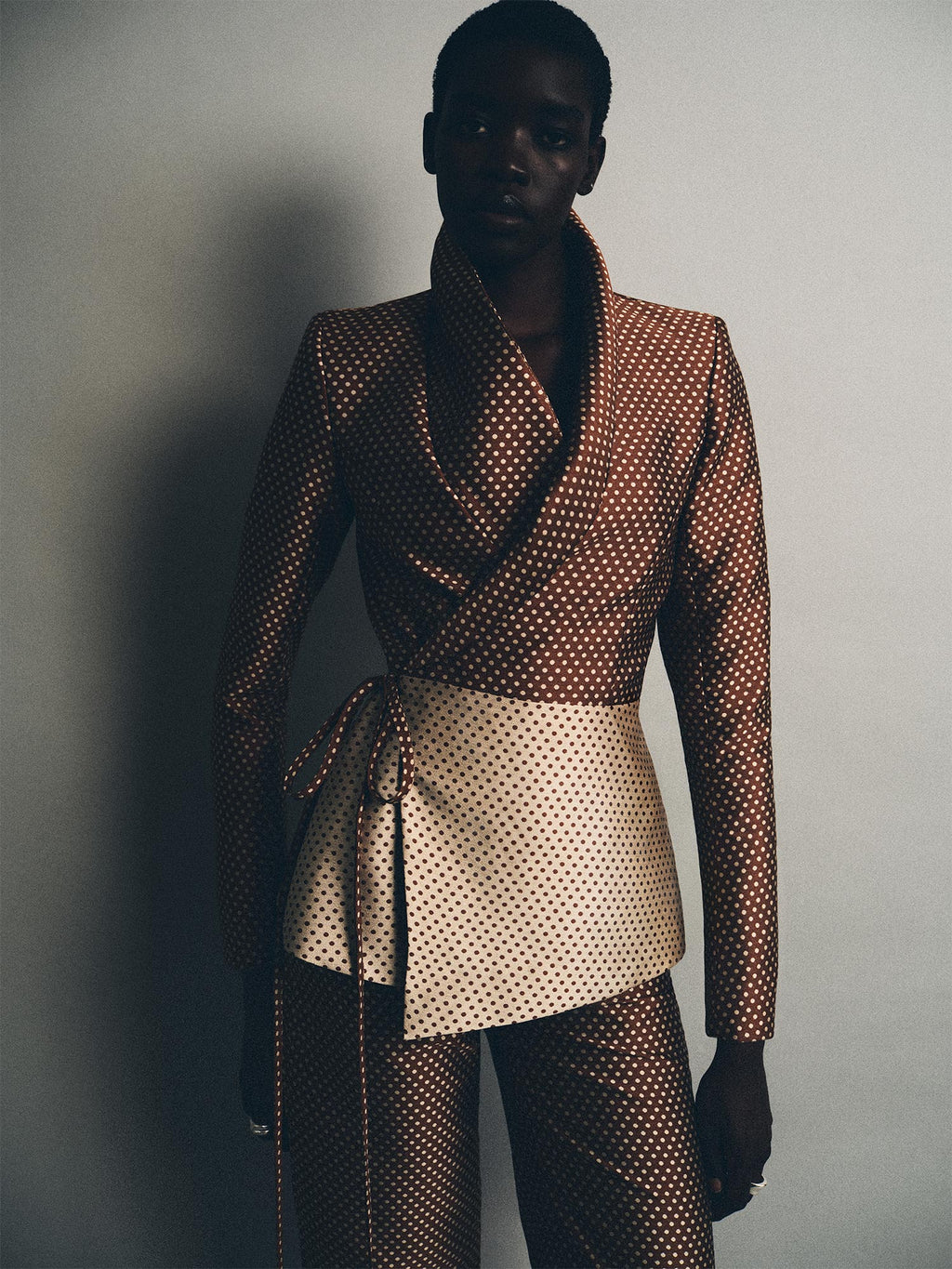 The Dot Jacquard Mikado Rapt Attention Blazer by Rosie Assoulin brings modern construction to playful tailoring. Cut in brown and ivory polka dot jacquard, the silhouette wraps and ties at the waist to create definition and a feminine peplum flare. A shawl collar and slit cuffs add balance, while the crisp mikado fabric maintains its form. Pair with the matching [] to complete the look. -