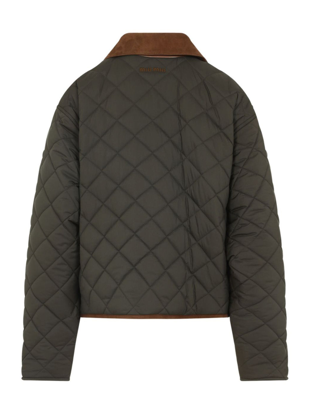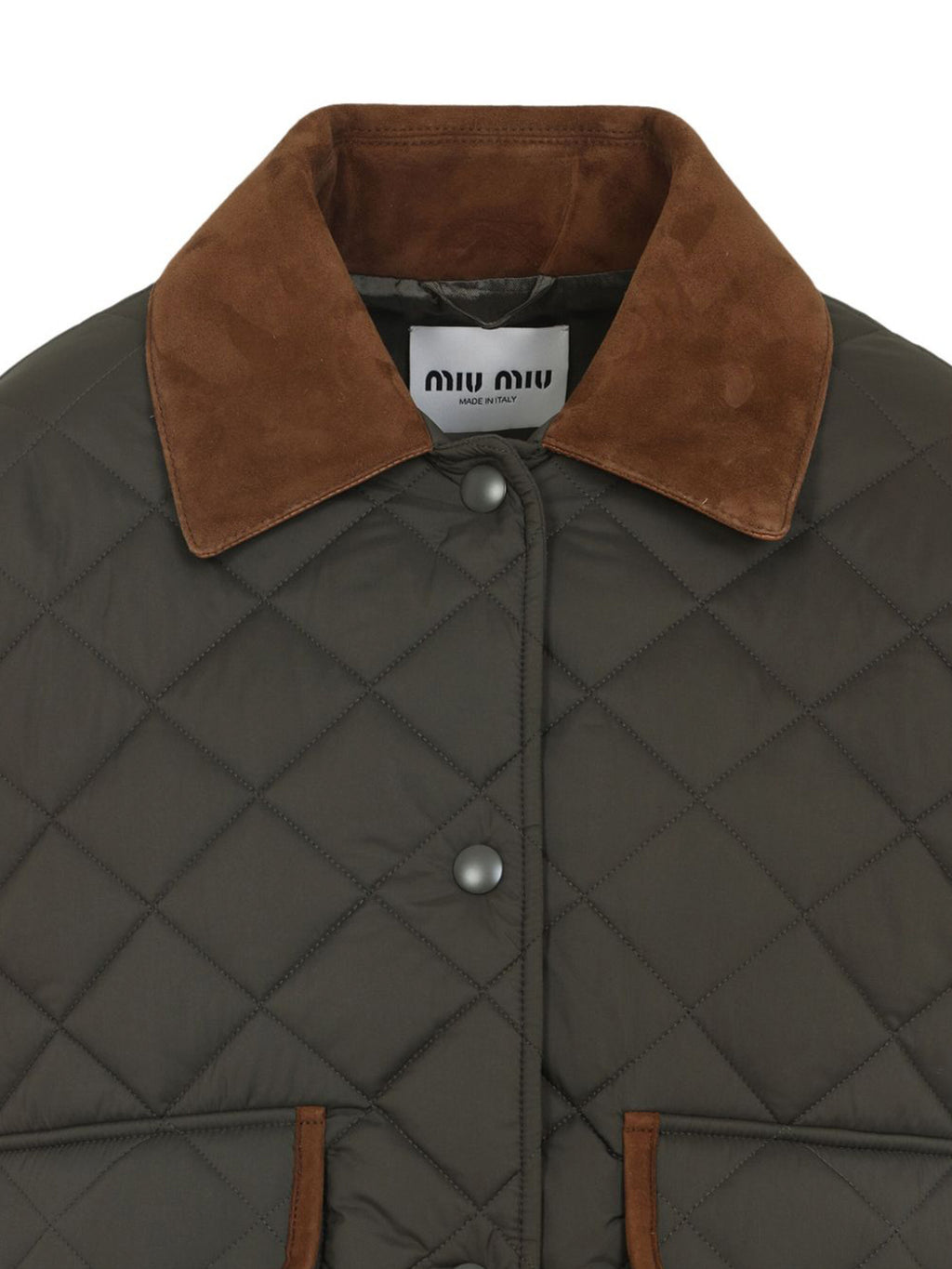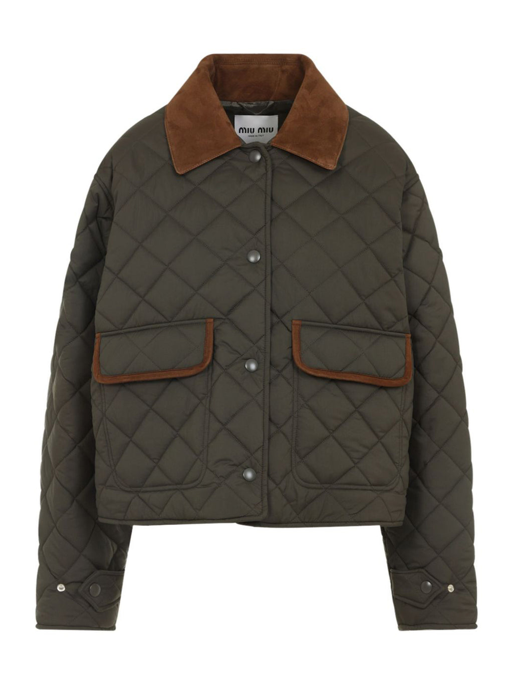 The Quilted Technical Pongé Blouson Jacket by Miu Miu redefines the puffer with a lightweight, boxy silhouette in military green. Detailed with a leather collar, patch pockets, and subtle suede and nappa accents, it’s finished with the house’s embroidered logo. -