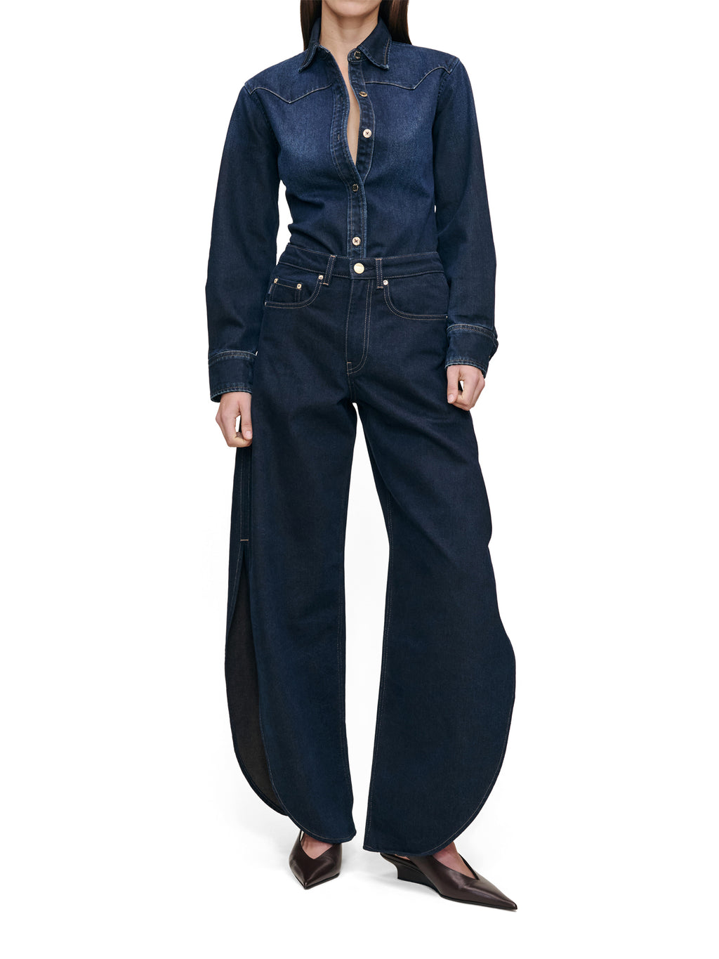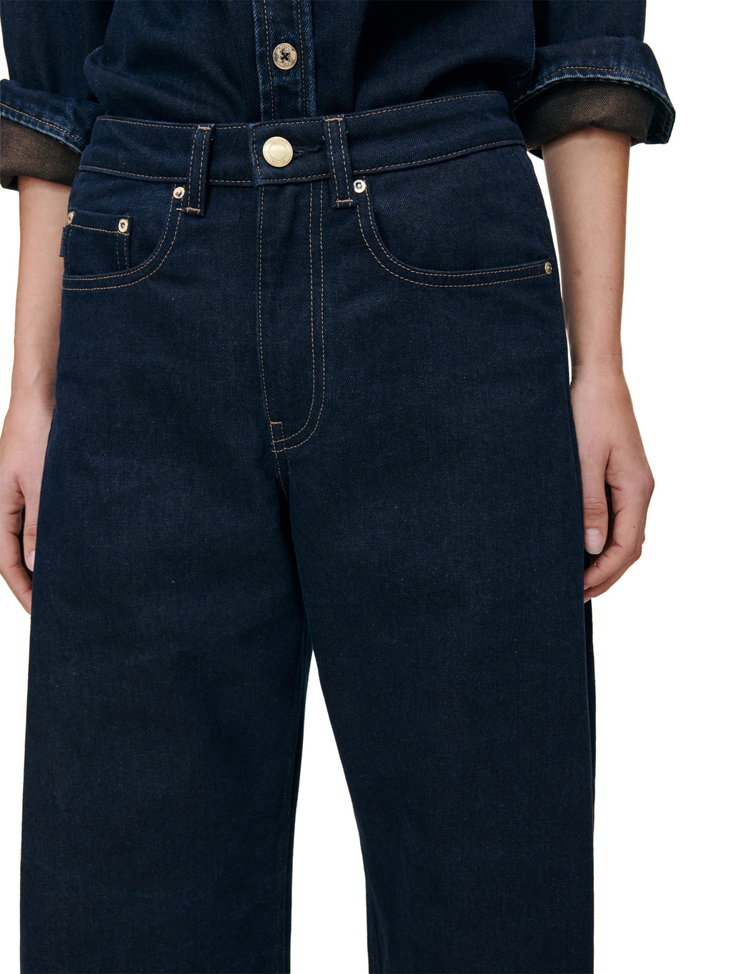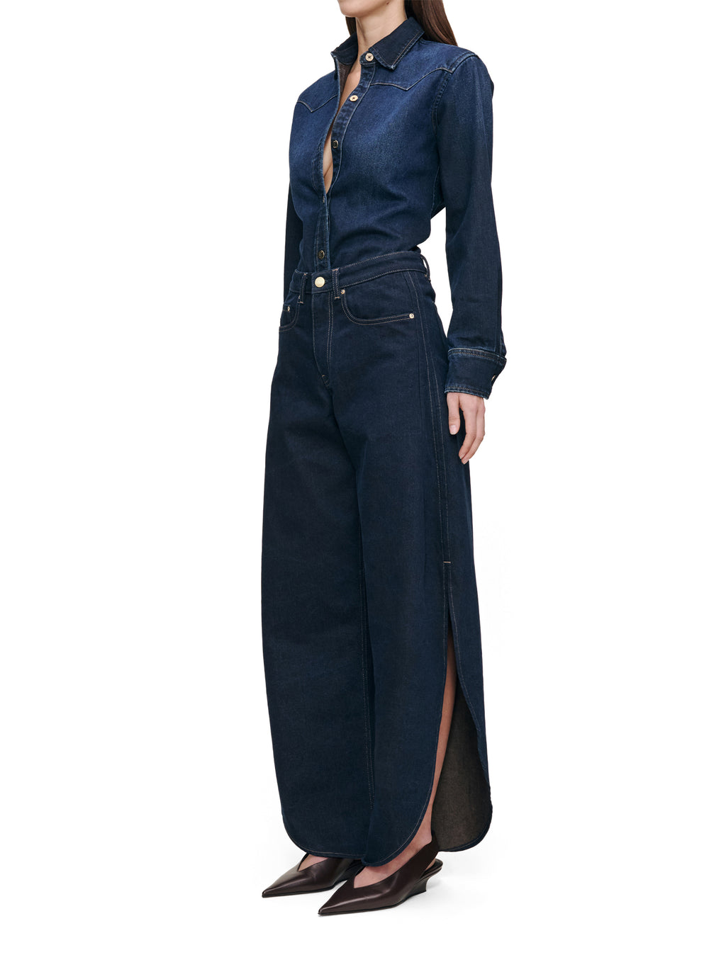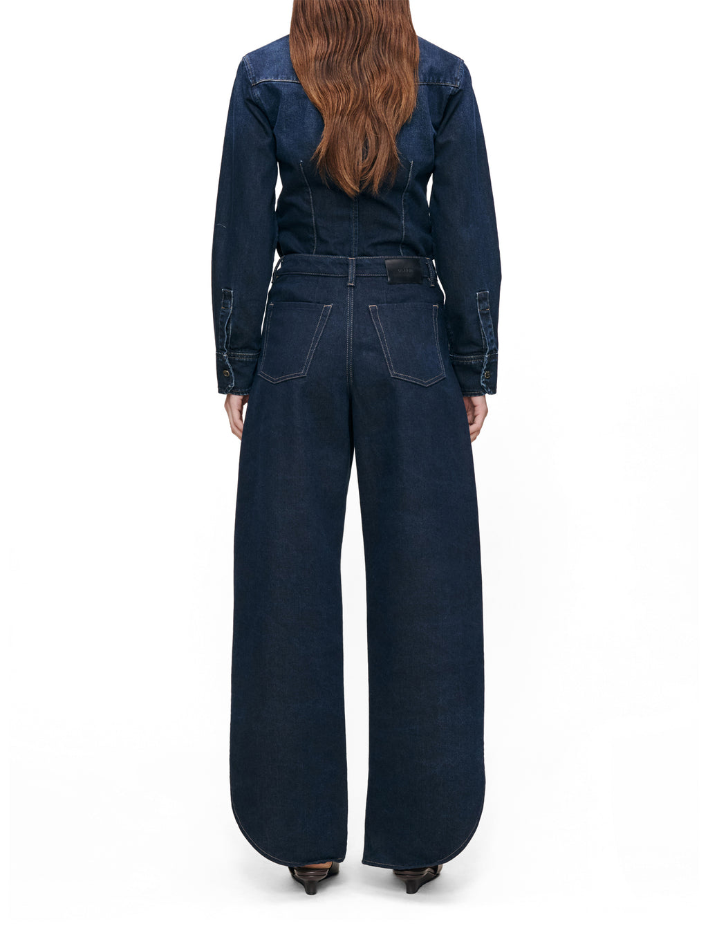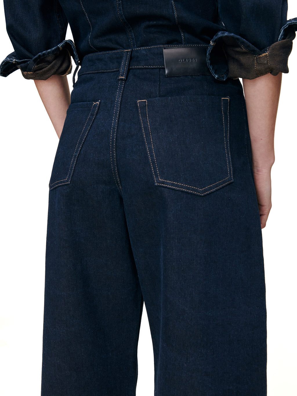 The Rori Wide Barrel High Rise Jeans by DL1961 feature an exaggerated barrel leg with long side slits that create a lengthening effect and modern proportion. Cut in Ventura, a dark rinse denim accented with gold hardware, khaki stitching, and a black back patch. Crafted from DL1961’s Original ’61 denim, the certified cotton weave molds to your shape over time for a personalized, authentic fit. -