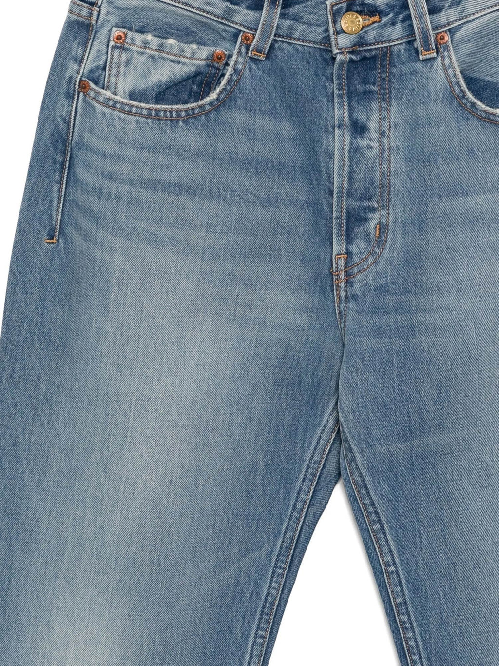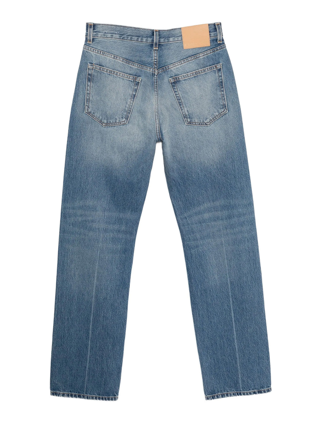 B Sides' Tilda Jeans introduce a curved inseam that creates a selvedge-inspired, leg-lengthening effect. Cut in a draped mid-rise straight leg, the style is finished with signature five-pocket construction, copper rivets, and a brass front closure. -