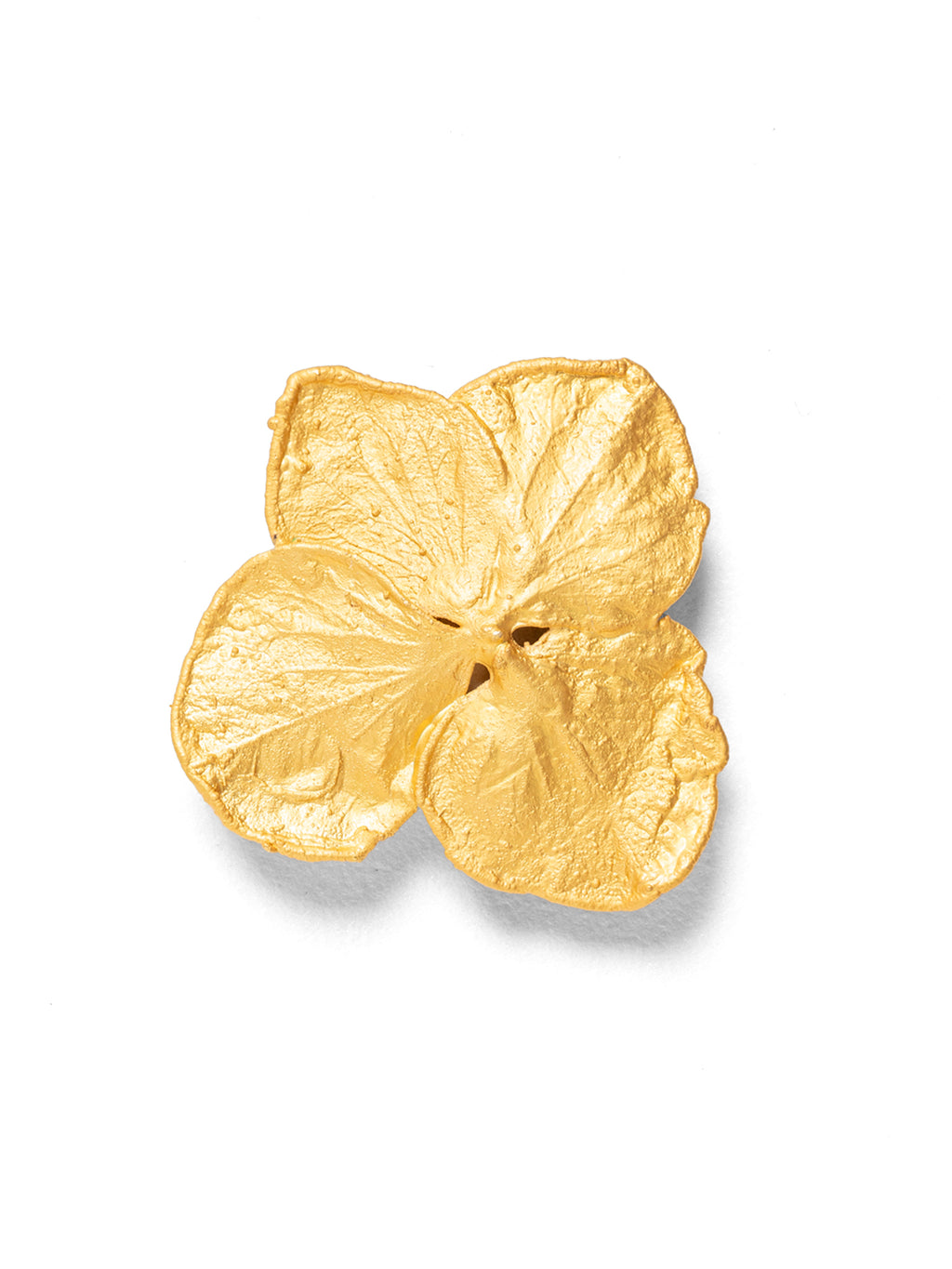 The Mini Hydrangea Button Cover by ALMA offers a distinctive way to elevate tailoring or denim. Made from preserved Hydrangea blooms, each flower undergoes ALMA’s mold-free jewelry technique, where it is metallized in 24k gold while the natural bloom remains inside. Its textures and subtle imperfections are celebrated, ensuring that no two pieces are ever the same. Wear this button cover alone or mix and match with other ALMA button covers for an even more striking look.