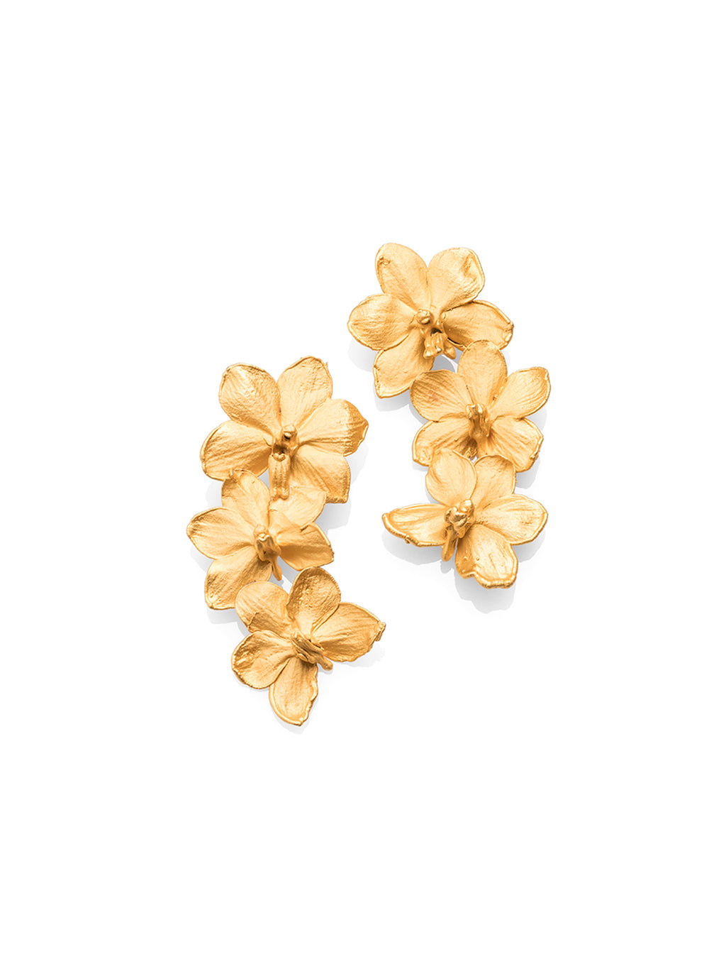 The Mini Vanda Orchid Bow Earrings by ALMA feature three Vanda orchids per earring, arranged in a delicate arc shape. Each orchid is preserved using ALMA’s mold-free jewelry technique, metallized in 24k gold while the natural flower remains inside. Its textures and imperfections are highlighted, ensuring each piece is truly one of a kind.