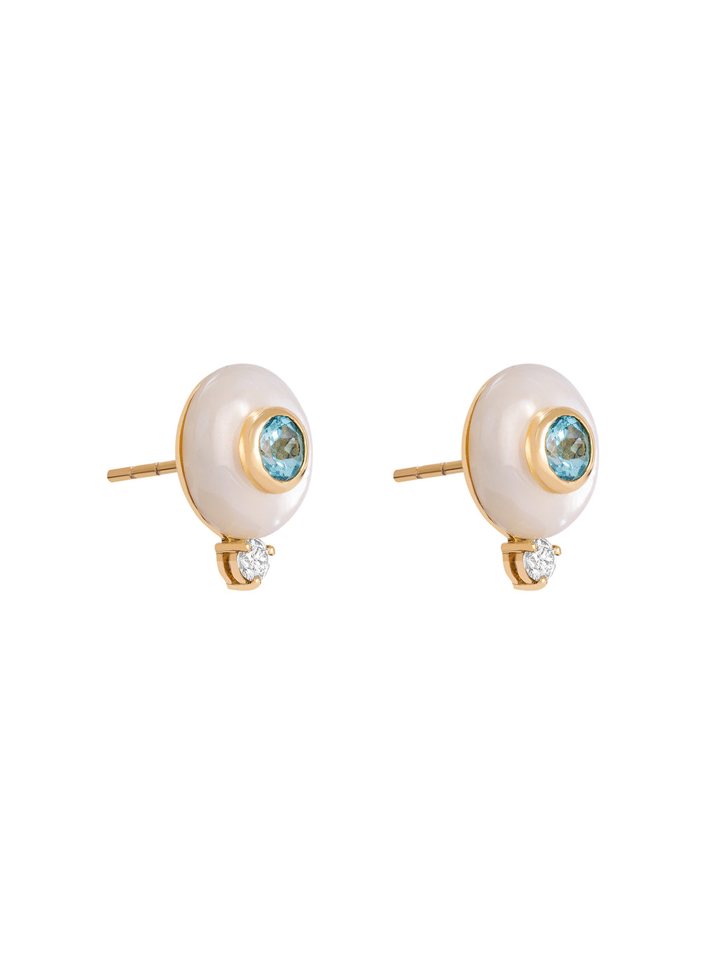The White One Bubble Earrings by Giovana Brait are crafted in 18k yellow gold, featuring a white agate bubble center accented with a smaller apatite and finished with a diamond detail. Designed to pair with the One Bubble Ring. This piece is ineligible for promotional discount. -