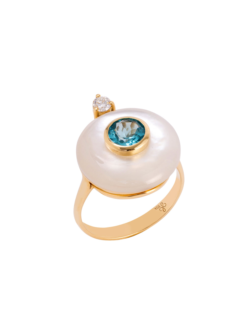 The White One Bubble Ring by Giovana Brait is crafted in 18k yellow gold, featuring a white agate bubble center accented with a smaller apatite and finished with a diamond detail. Designed to pair with the One Bubble Earrings. This piece is ineligible for promotional discount. -