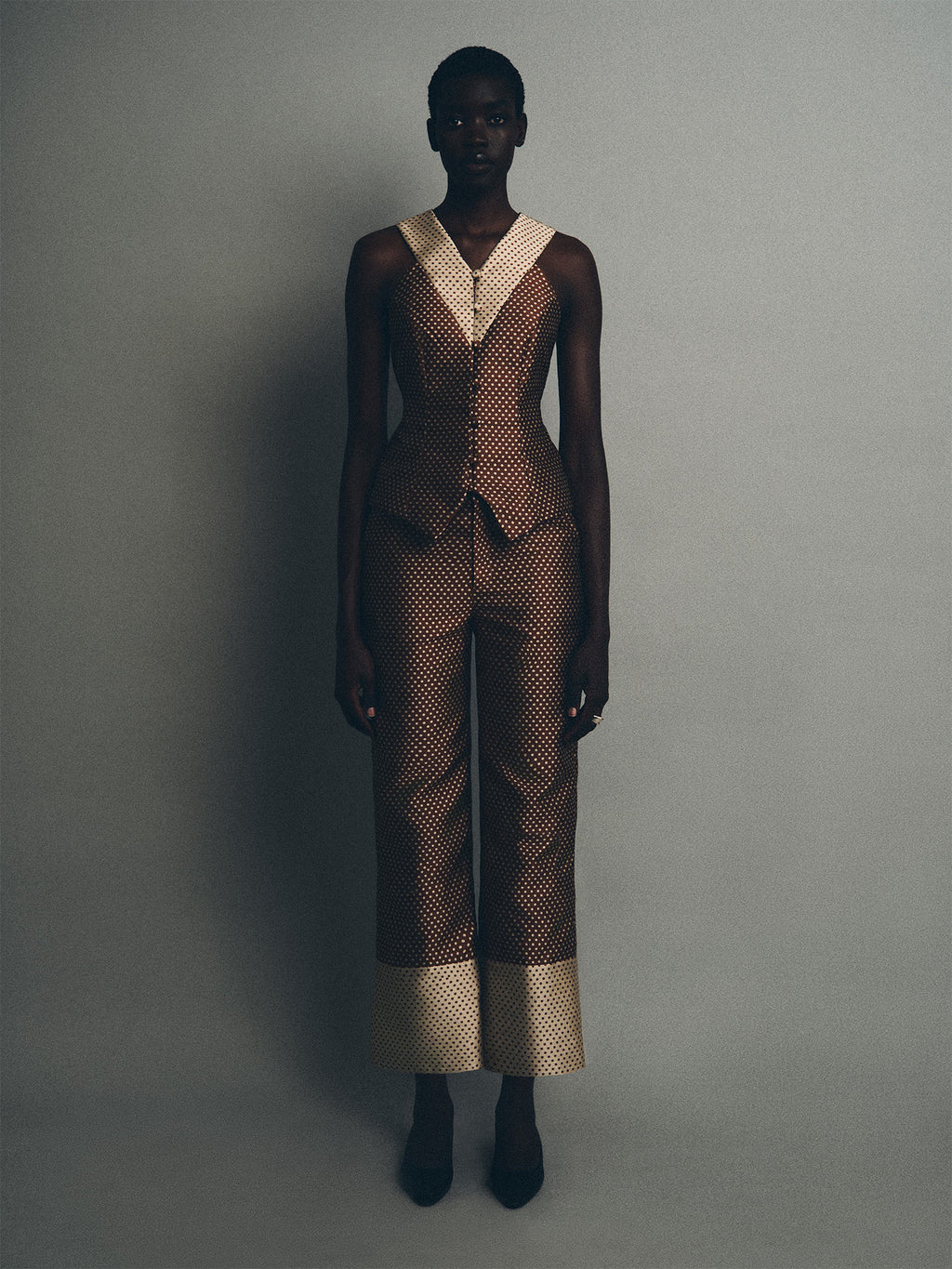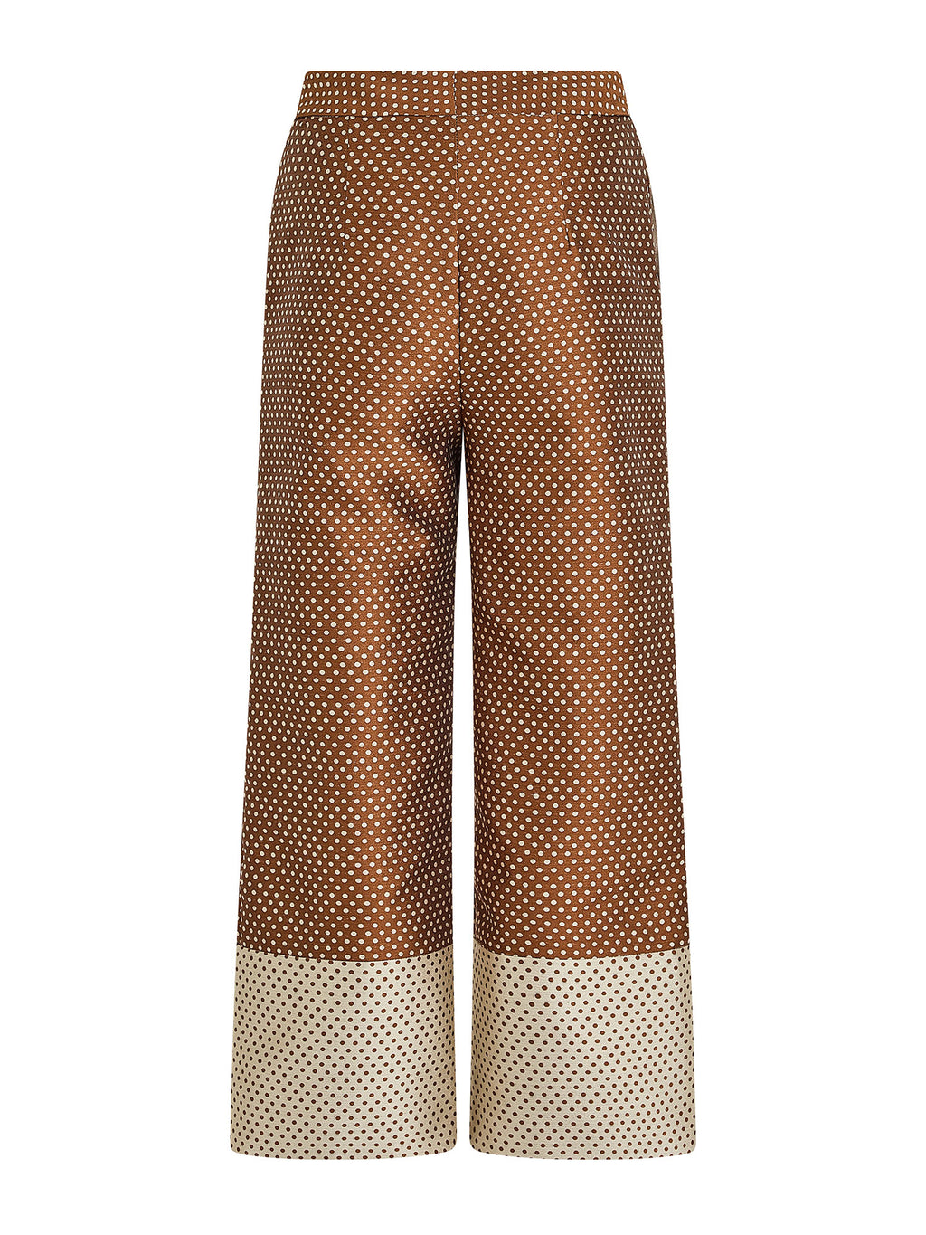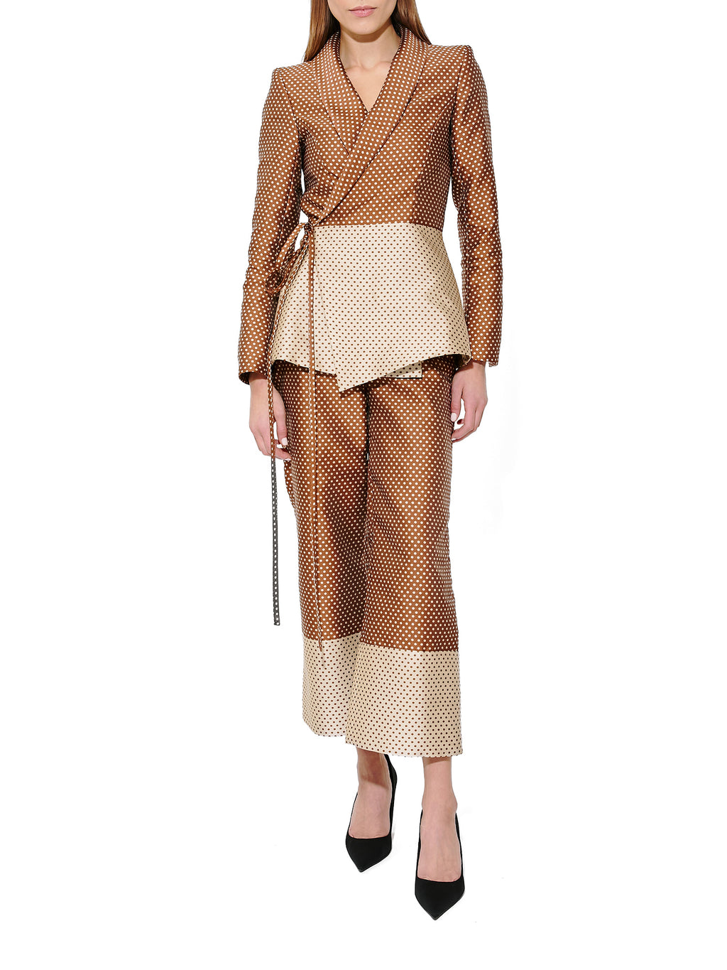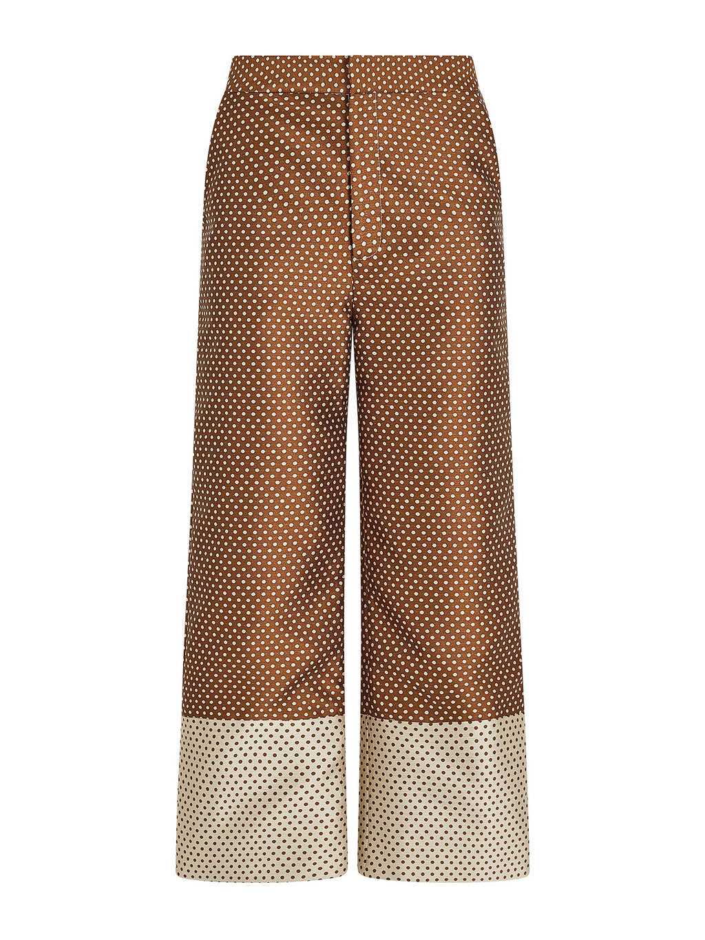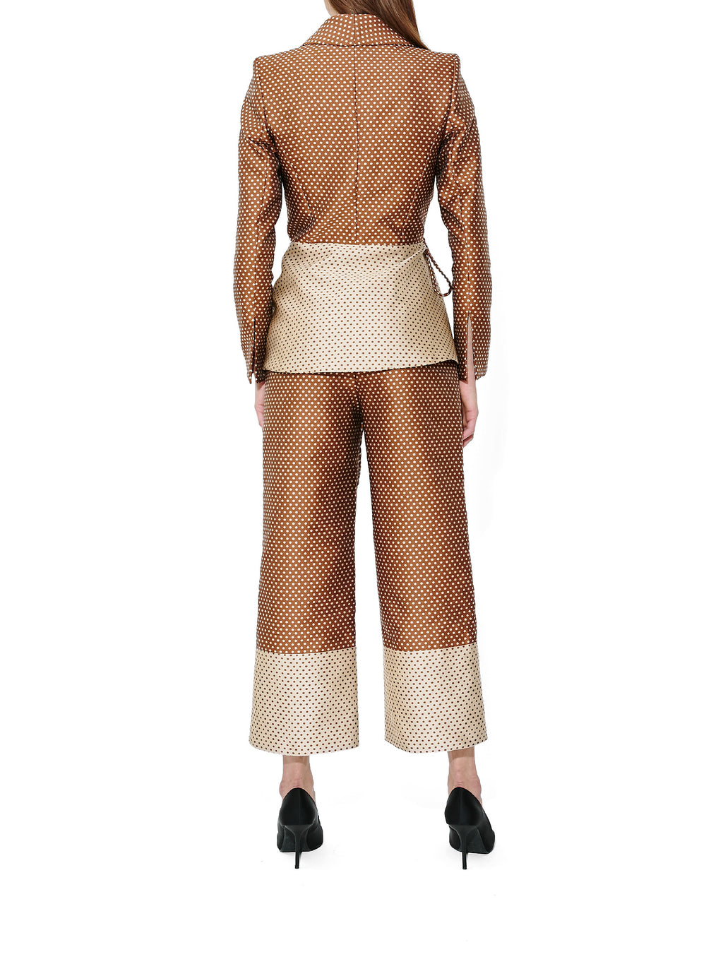 The Dot Jacquard Mikado Boyfriend Trousers by Rosie Assoulin reinterpret classic tailoring through a playful yet polished lens. Cut from structured brown and cream dot jacquard, the high-waisted silhouette features a crisp wide leg and contrasting cream hem for a subtle twist on tradition. Crafted in sumptuous mikado, these trousers balance precision and charm—especially when paired with the matching Rapt Attention Blazer. -