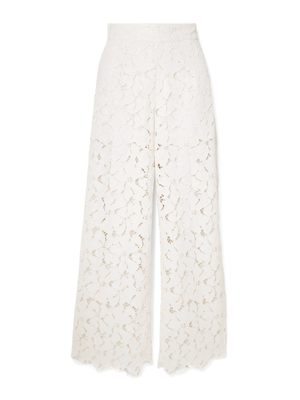 Loretta Caponi’s Cipro pants are cut from beautifully corded lace with scalloped trims that lend a light, romantic finish. The straight-leg silhouette keeps the look clean and effortless. Pair them with the matching Iole blouse for a cohesive, feminine ensemble.