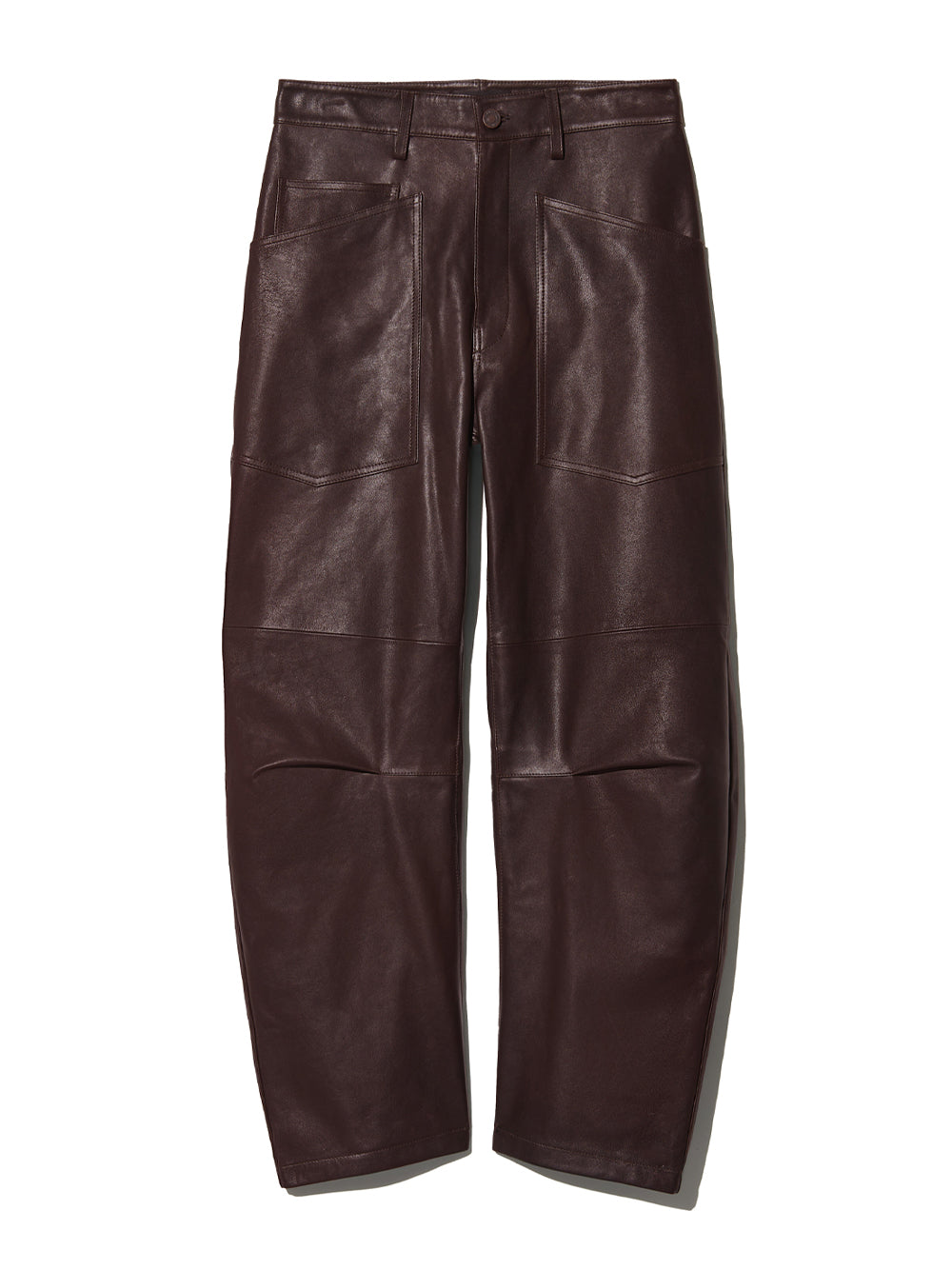 The Shon Leather Pants by Nili Lotan are cut from dark brown Italian lambskin in a relaxed mid-rise silhouette. Featuring a distinctive curved leg, the design is finished with seam detailing at the knees, an inseam gusset, and top-stitched patch pockets. Belt loops, a zip fly with shank closure, and full lining complete the look. -