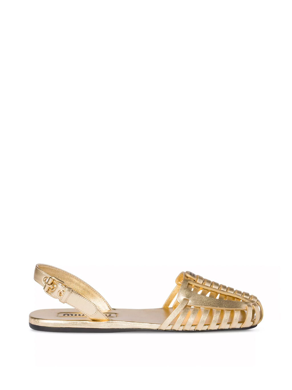 Crafted in metallic leather, Miu Miu’s Fisherman Sandals feature a classic round toe with intricate woven detailing across the front. The slingback strap ensures a secure fit, while the flat sole keeps the silhouette effortless and versatile. A modern take on a timeless warm-weather staple. -