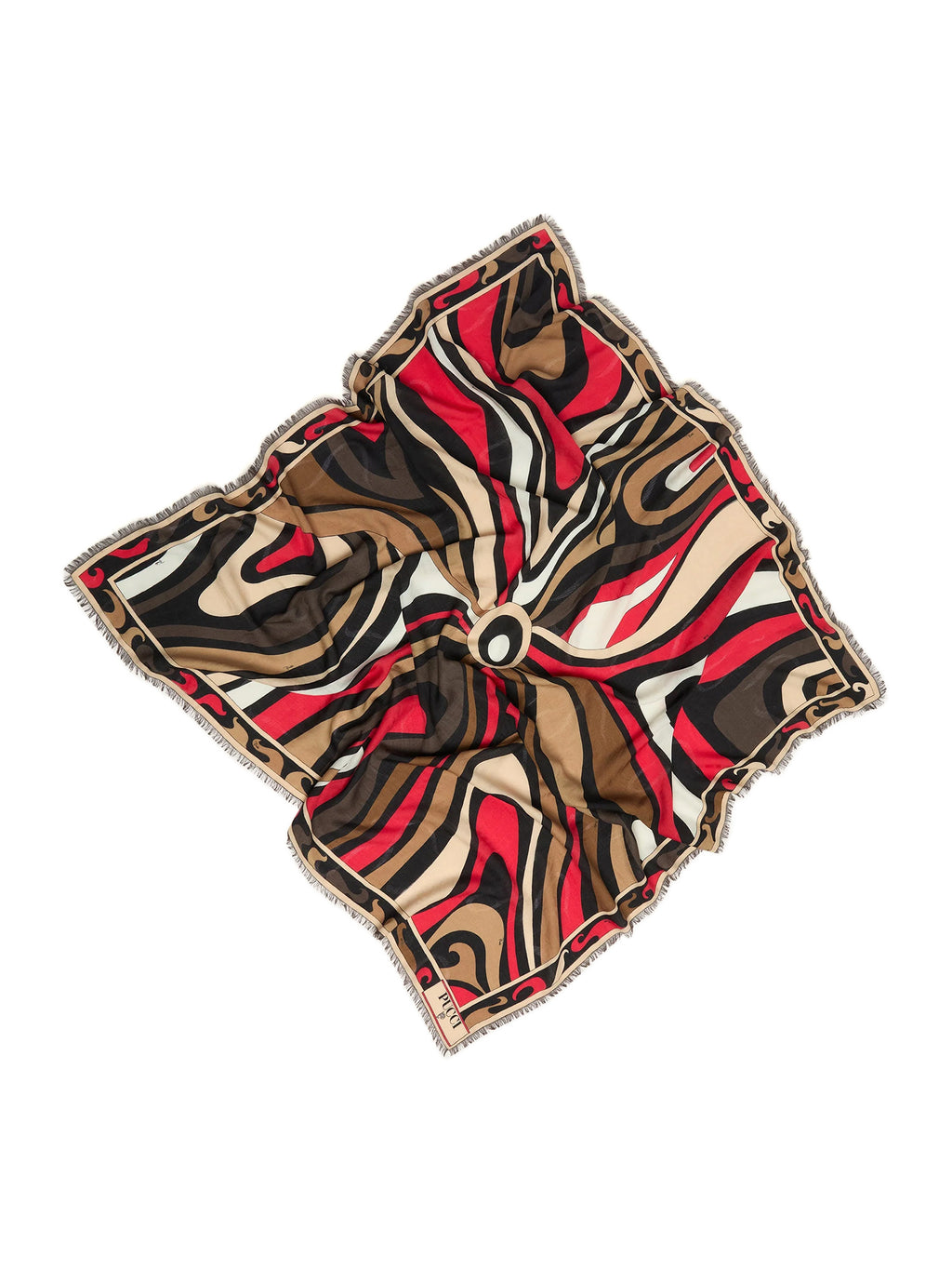 Pucci’s Marmo-Print Pashmina elevates any ensemble with softness and sophistication. Crafted from a silk and wool blend, the scarf is fully adorned with the iconic Marmo print in black and gold, accented with pops of red. Fringed edges add subtle movement and a touch of glamour, making it a versatile accessory for layering over coats, dresses, or tailored separates.