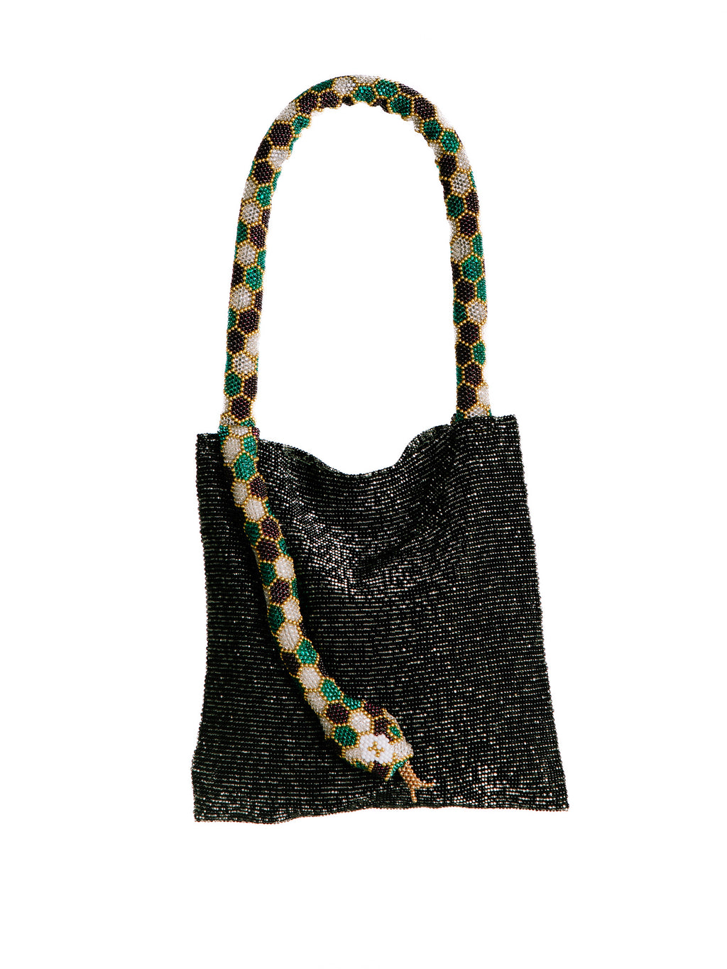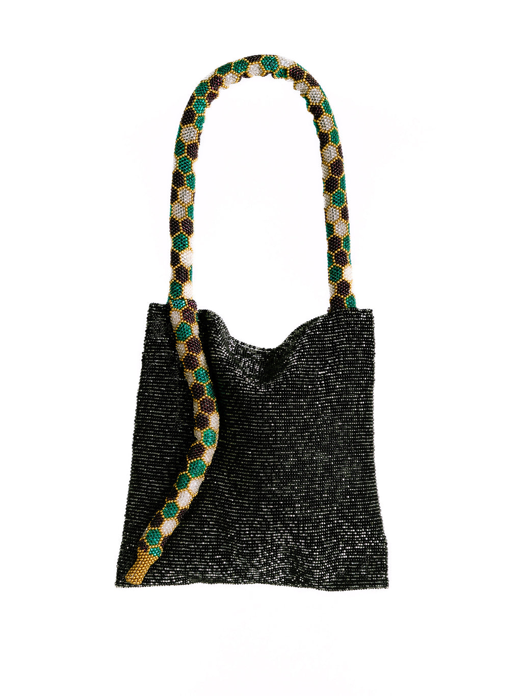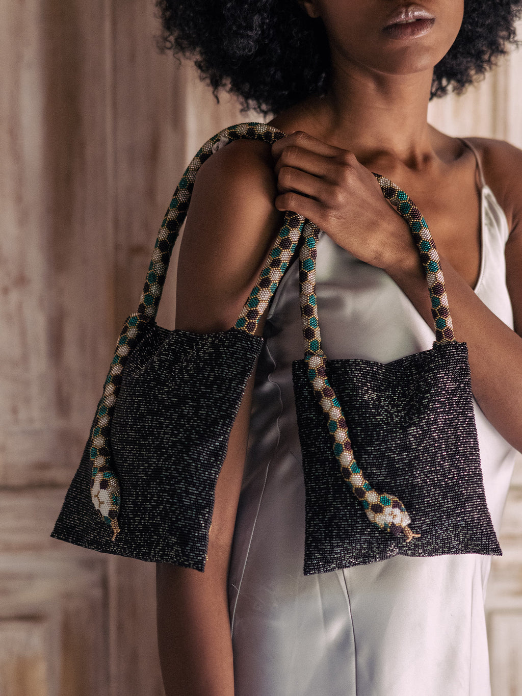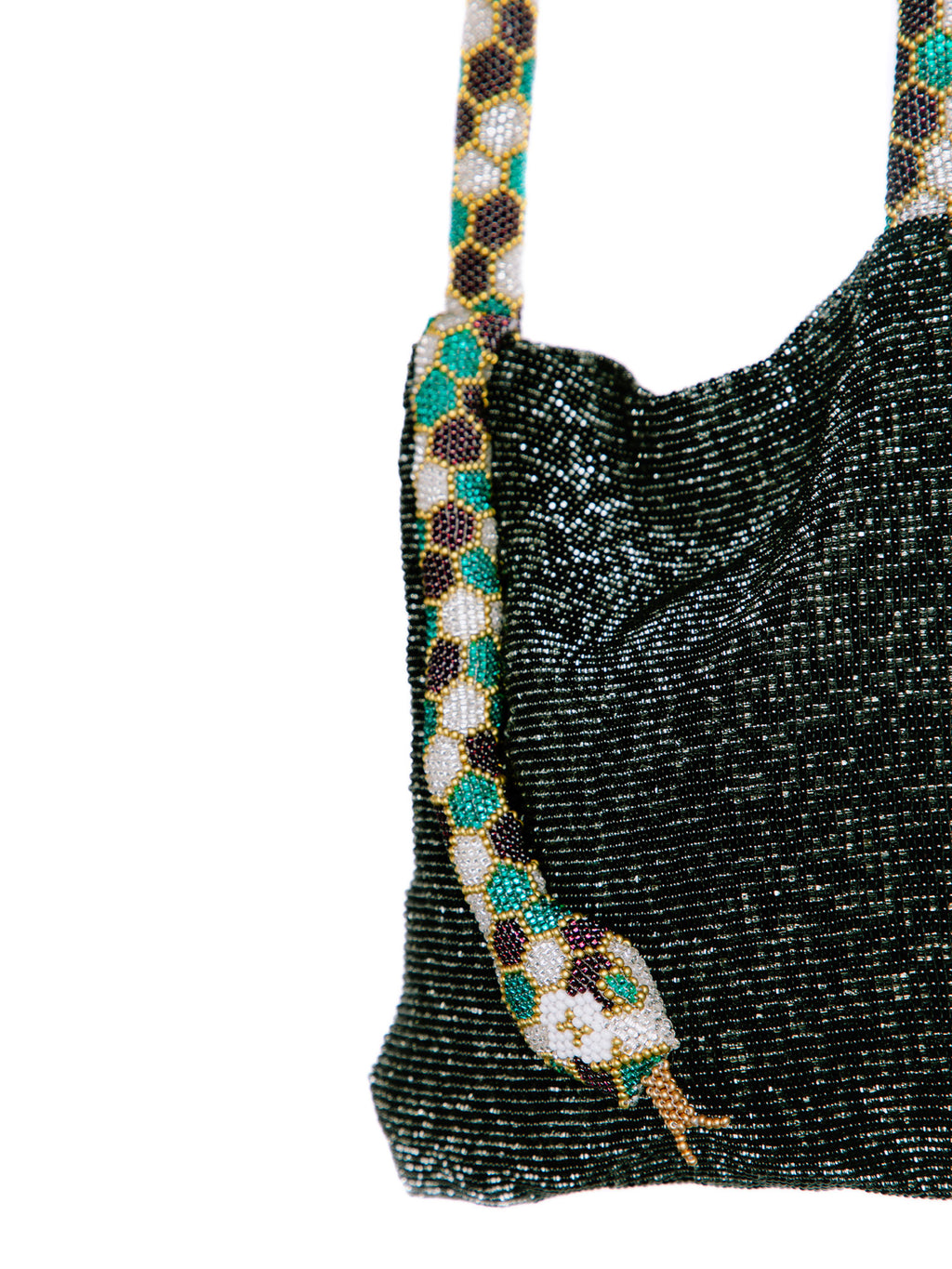 Sac de Soul’s Serpent Bag is a hand-woven statement piece, crafted by Guatemalan artisan women using ancestral beadwork techniques. Over 32,000 Czech glass seed beads create its sculpted square silhouette, while a three-dimensional serpent curves down the front to form the handle. A legacy design made to endure, it’s both art and accessory. The dust bag is produced by Mieelo, a women-led social impact business dedicated to creating meaningful opportunities for women in Guatemala. -
