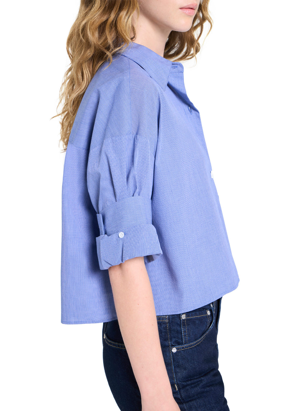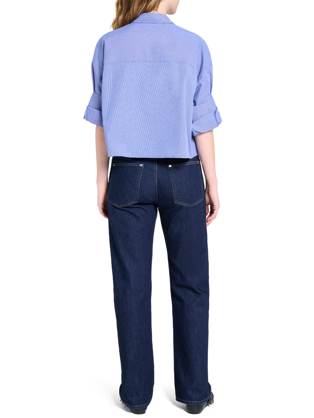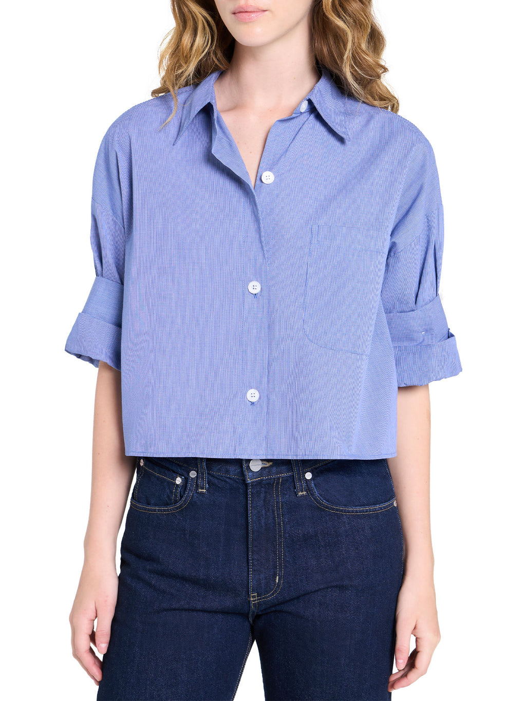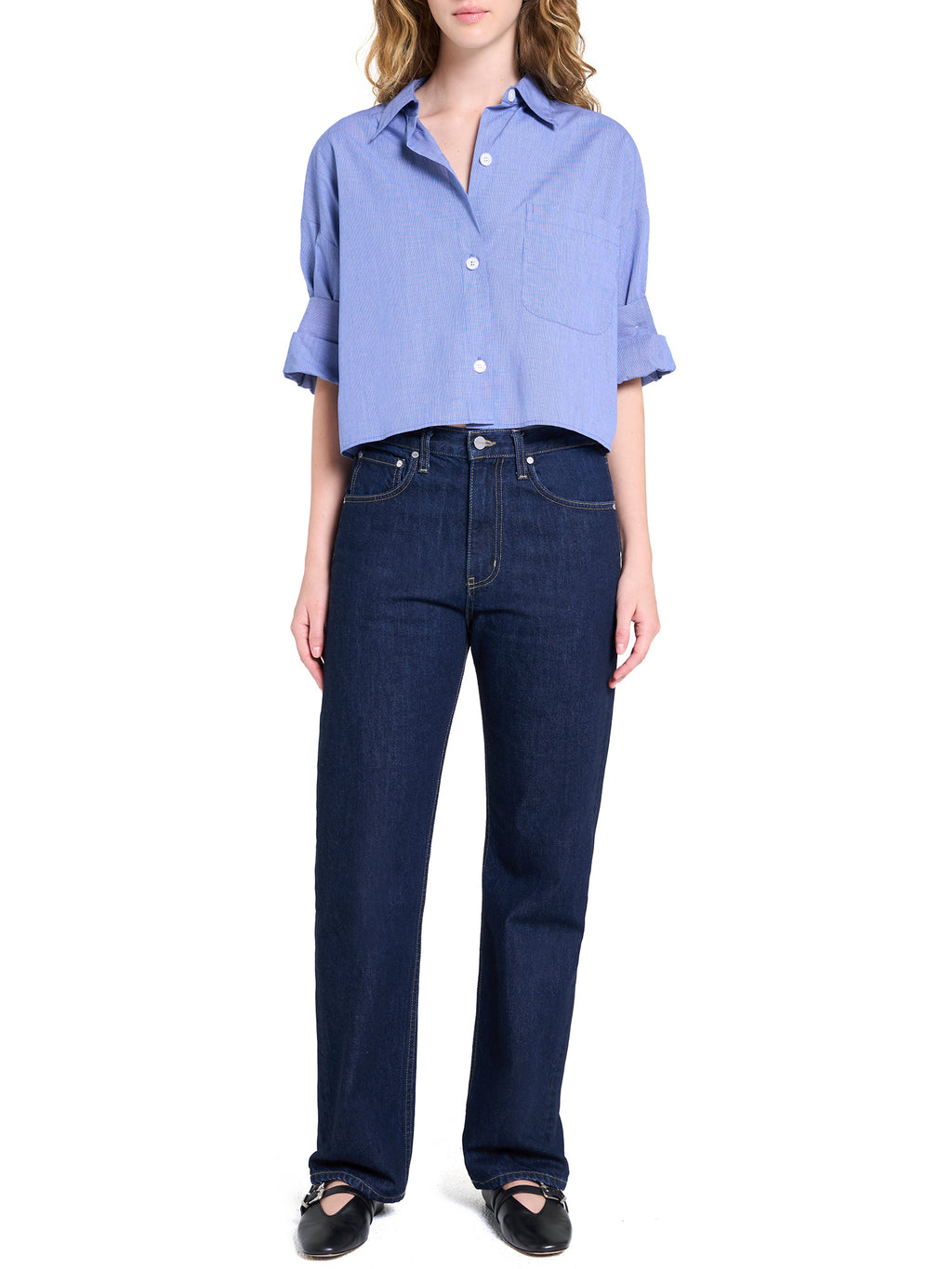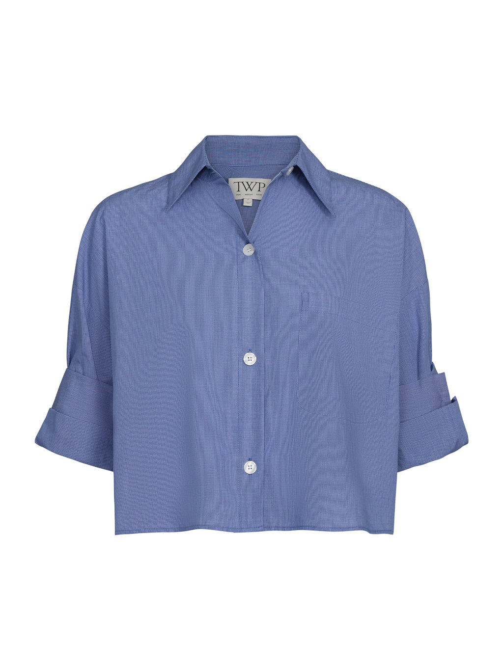 The Next Ex Shirt by TWP brings a playful twist to a classic button-down. Cut in navy-and-white micro check cotton, its cropped, boxy silhouette is finished with a chest pocket, spread collar, and signature double roll cuffs for an effortlessly cool finish. -