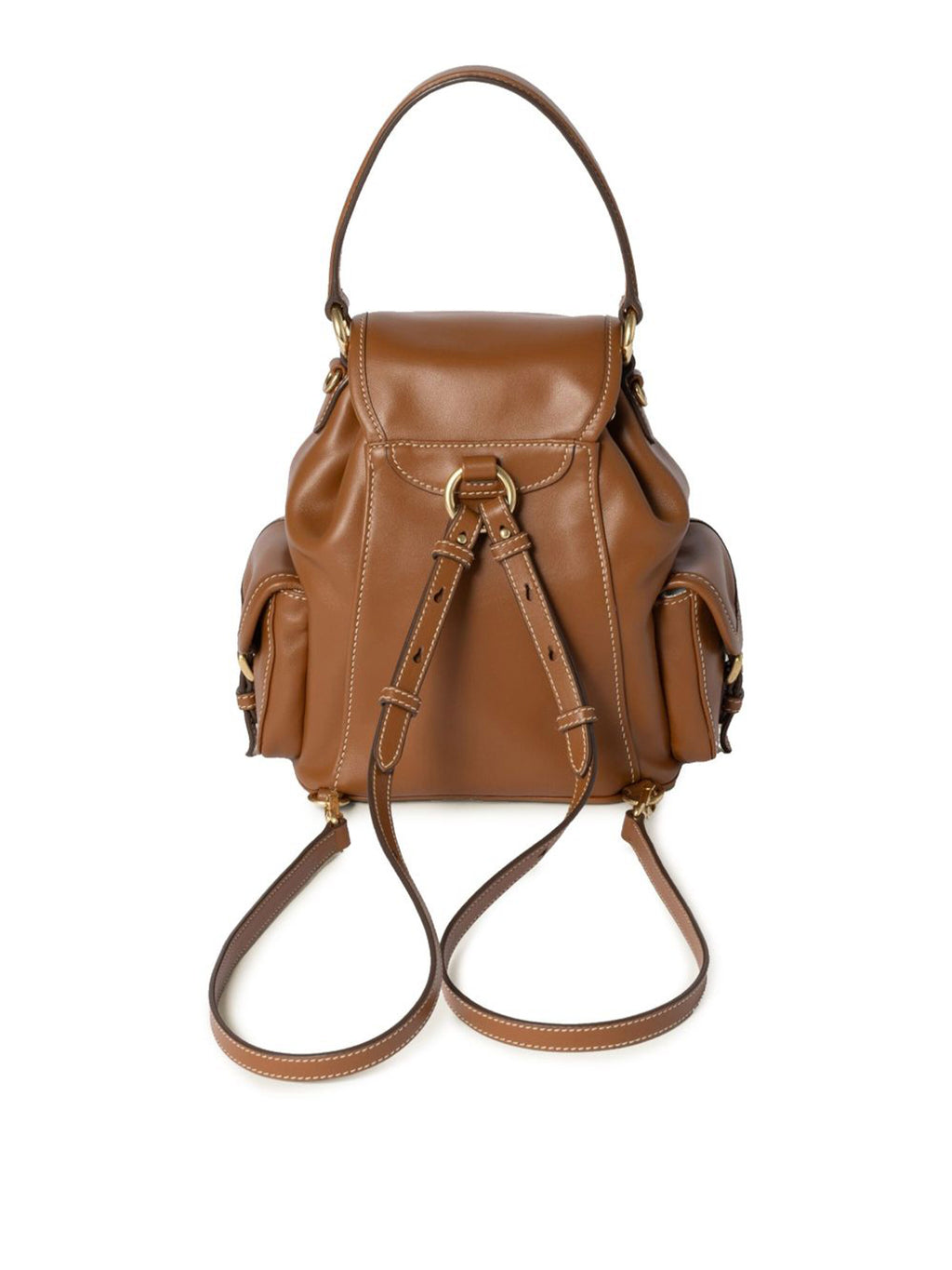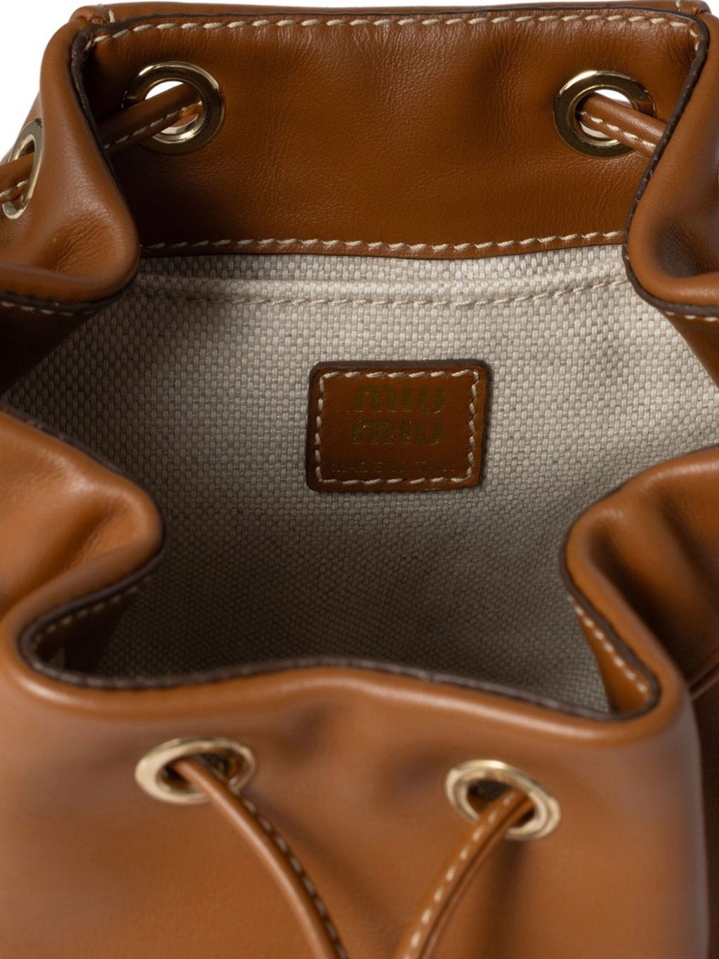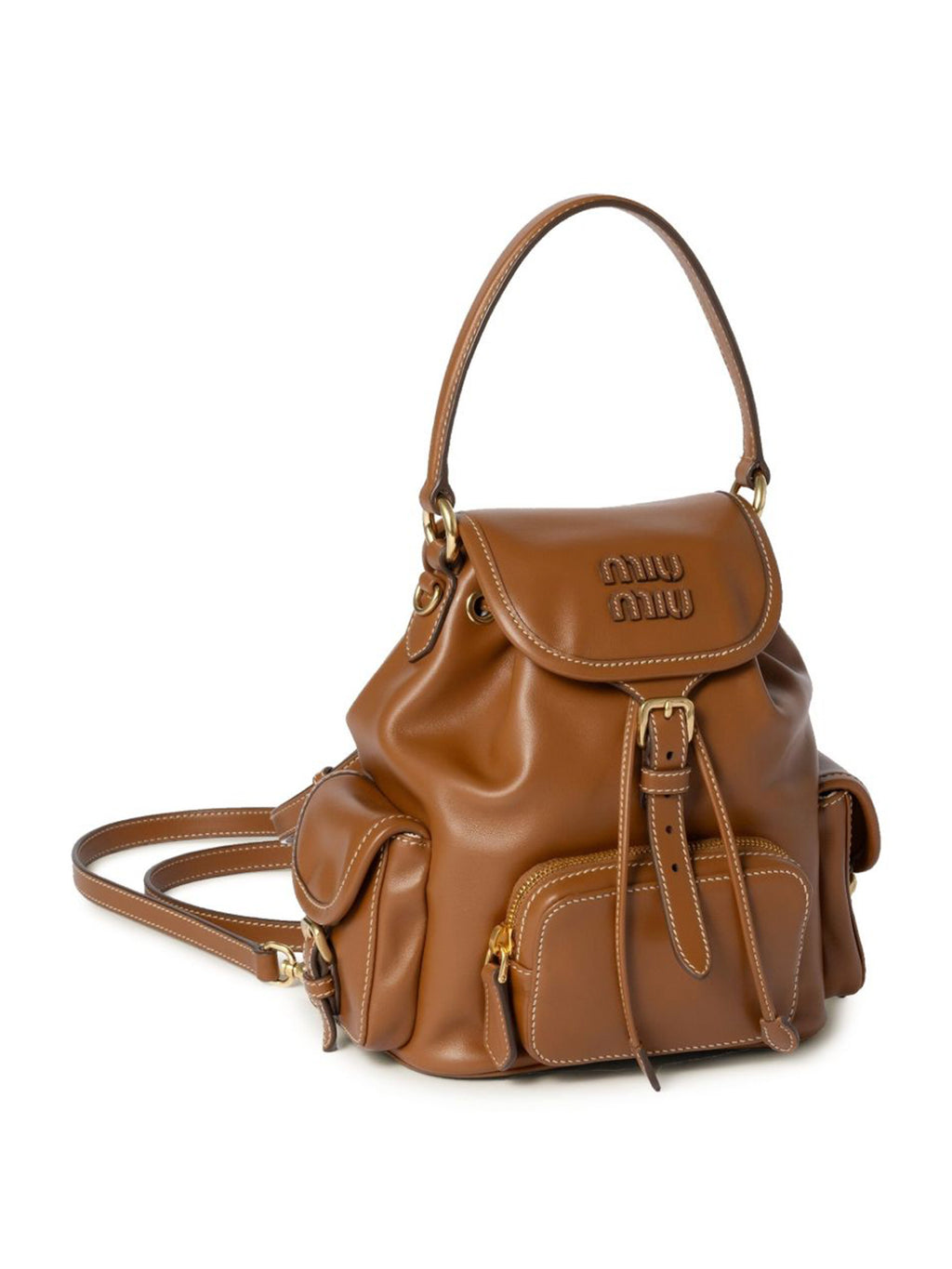 Miu Miu’s Leather Backpack channels classic school style with a modern twist. Crafted from smooth leather with gold-tone hardware, its multi-pocket design and convertible straps let you wear it as a backpack or crossbody.