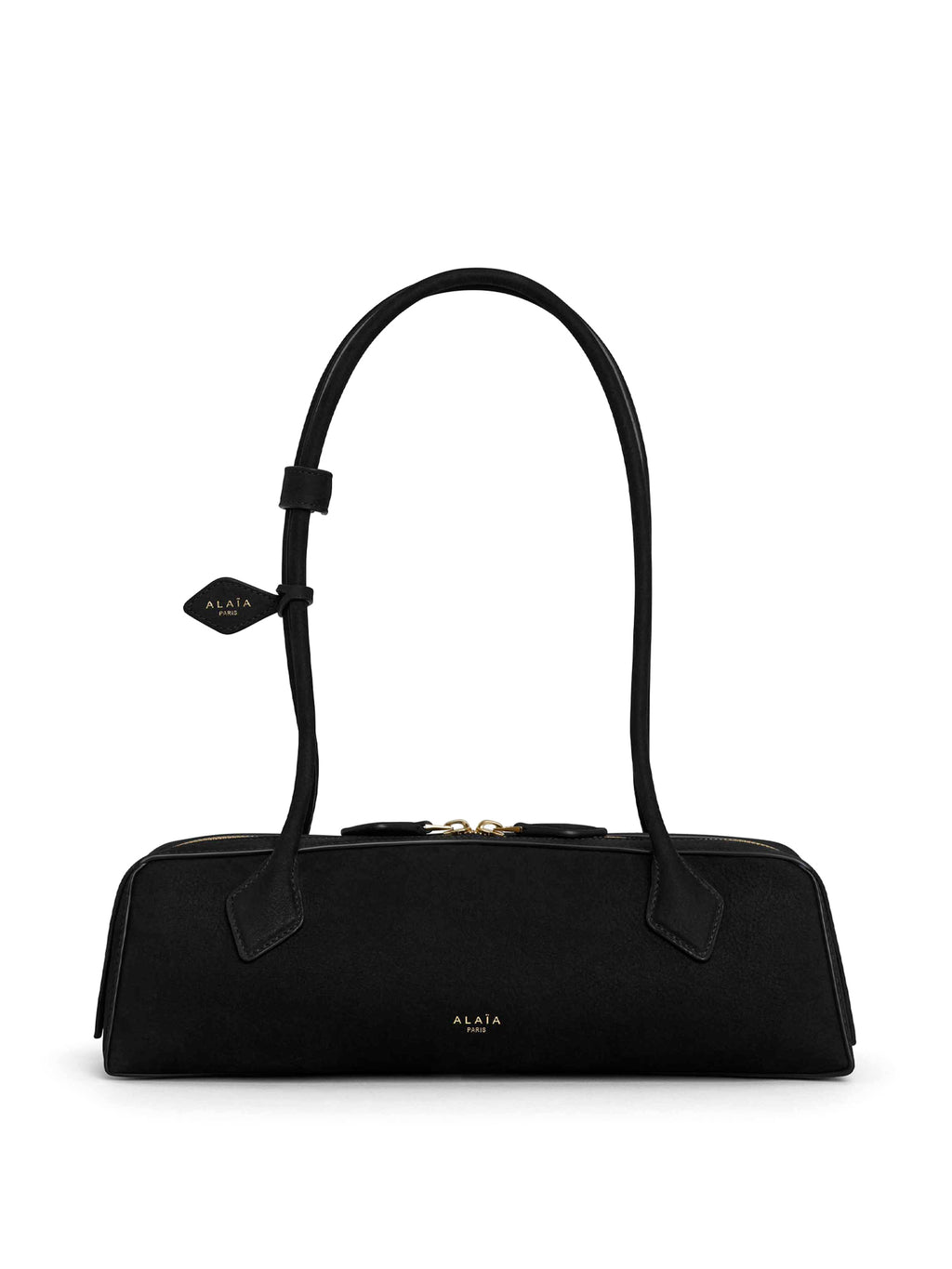 The Nubuck Medium Le Teckel Bag by Alaïa is defined by its elongated silhouette and supple nubuck calf leather. Long tubular handles with decorative ties frame the design, while a double zip closure and interior pocket with a removable mirror enhance functionality. Designed for effortless shoulder carry.