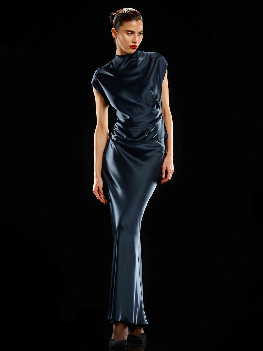 The Sei’s Bias Silk Maxi Skirt sits comfortably at the true waist with a hidden side-zip closure for a seamless finish. Crafted in cool slate blue, it pairs perfectly with the matching High Neck Drape Top.