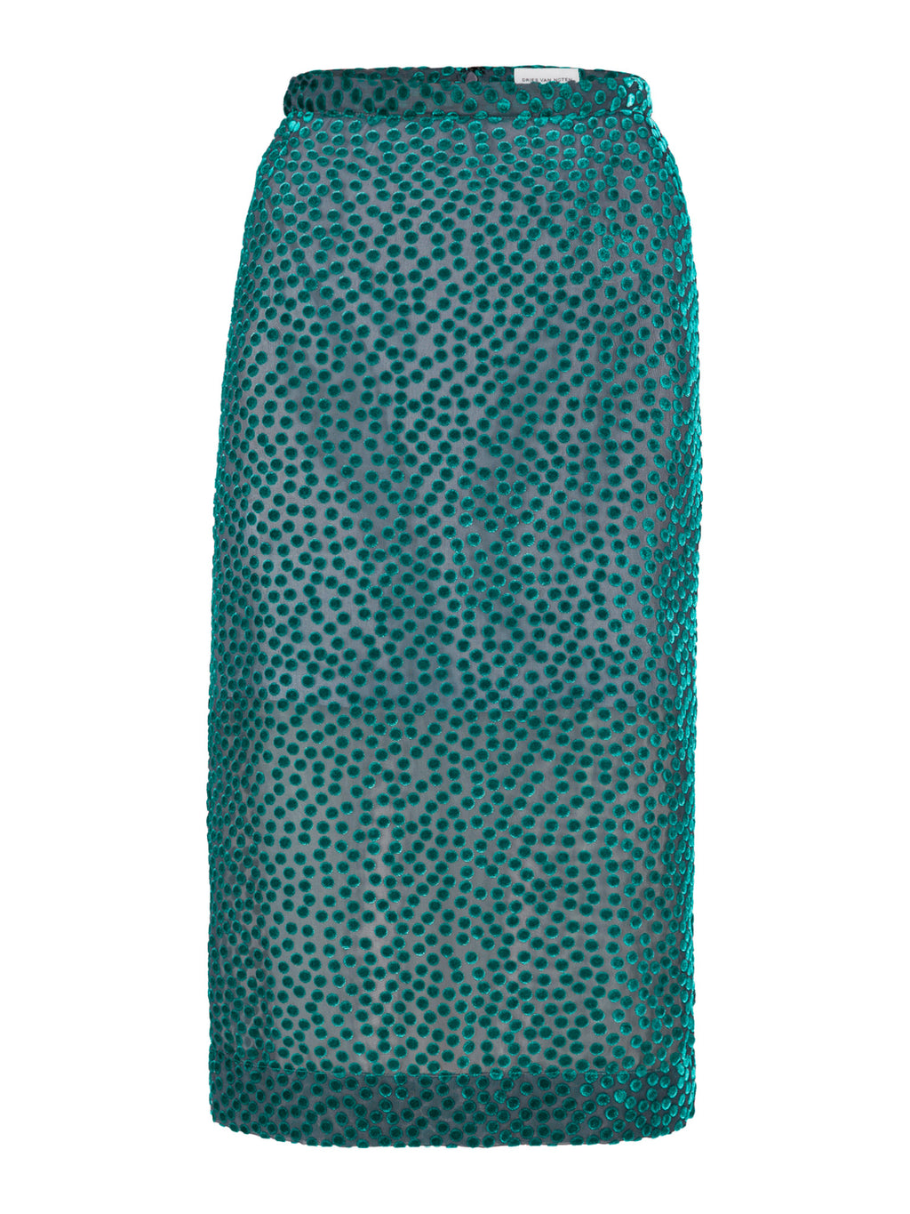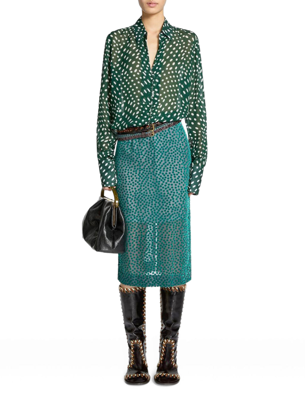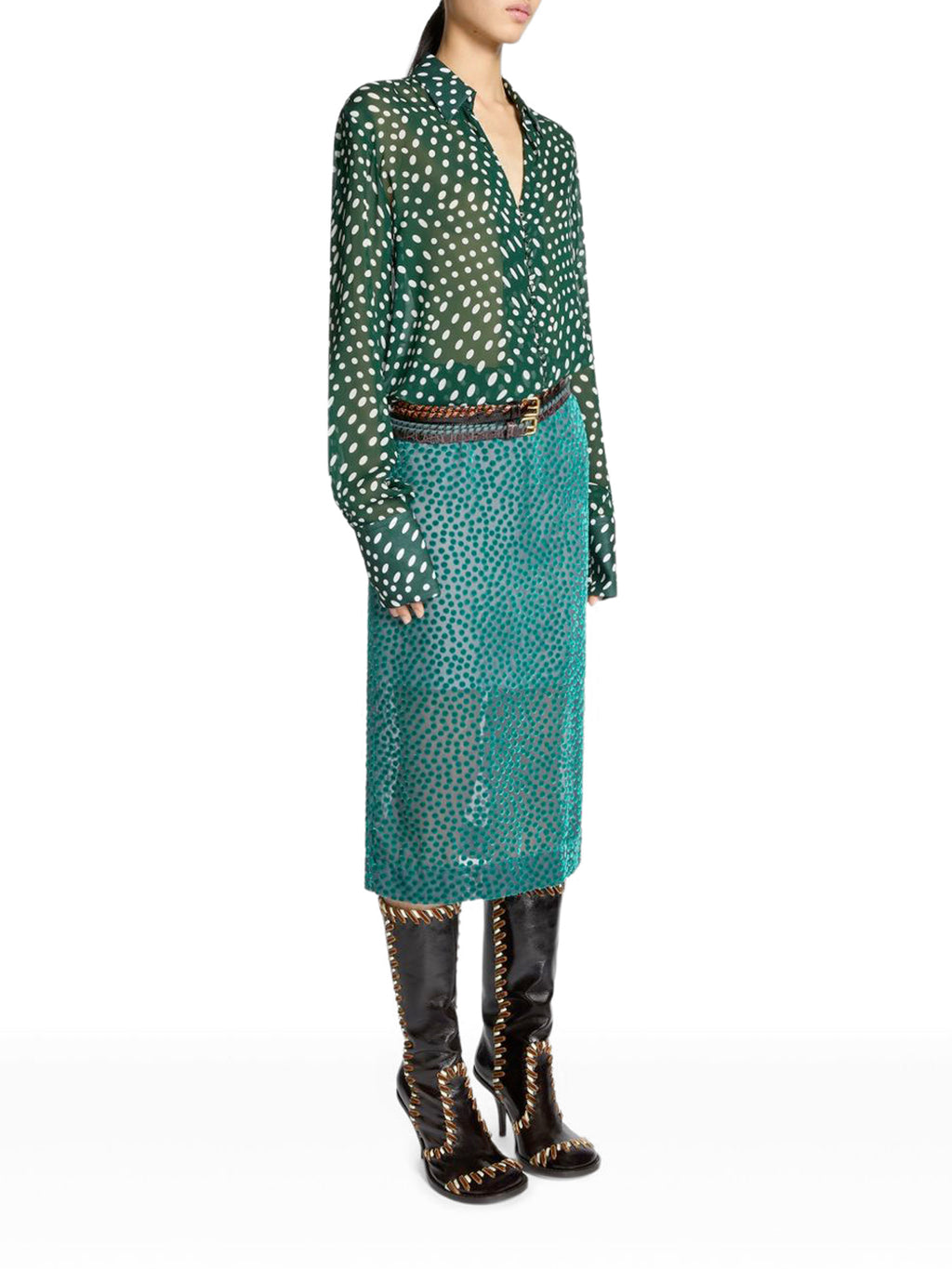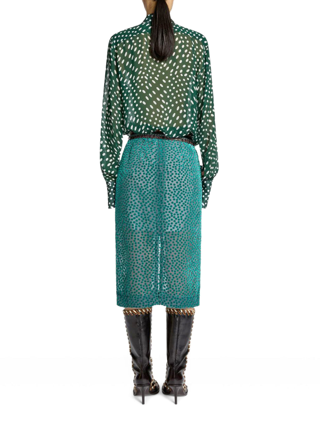 Dries van Noten’s Sokna Devoré Skirt is a knee-length design in double-dyed viscose and silk devoré with a sheer overlay and polka dot pattern. Style it with the matching top for a coordinated look.