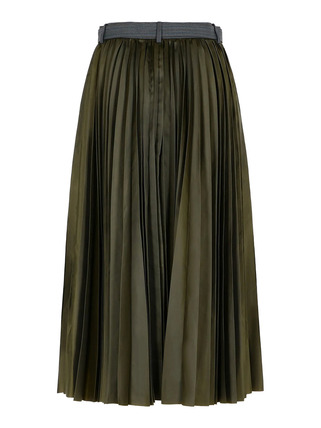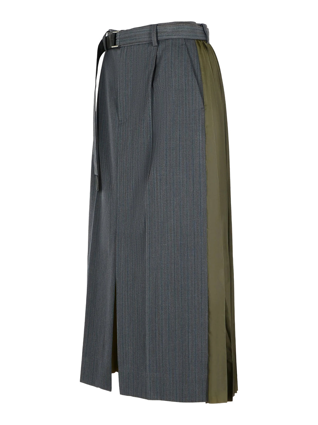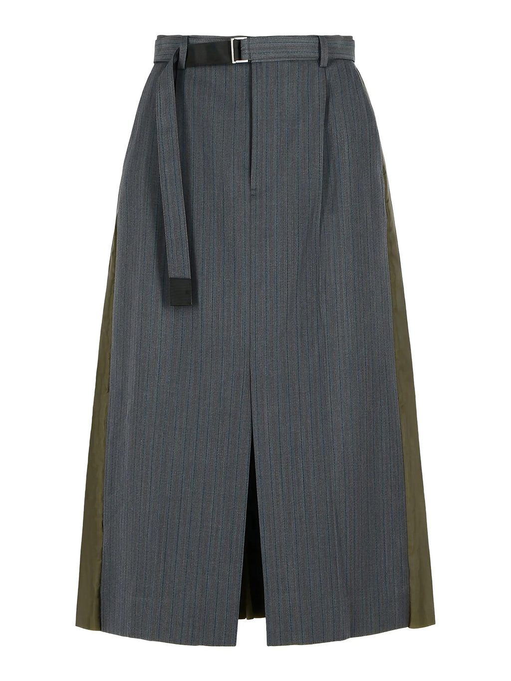 Sacai’s Striped Doeskin Skirt embodies the label’s mastery of hybrid design. Cut from striped woven fabric in dark gray, black, and burgundy, the silhouette unfolds into a pleated satin-twill panel at the back in deep green—a dynamic play of texture and movement. Capturing Sacai’s experimental spirit while remaining strikingly wearable, this skirt pairs perfectly with the matching Striped Doeskin x Wool Knit Cardigan and sleek boots or platform loafers. -
