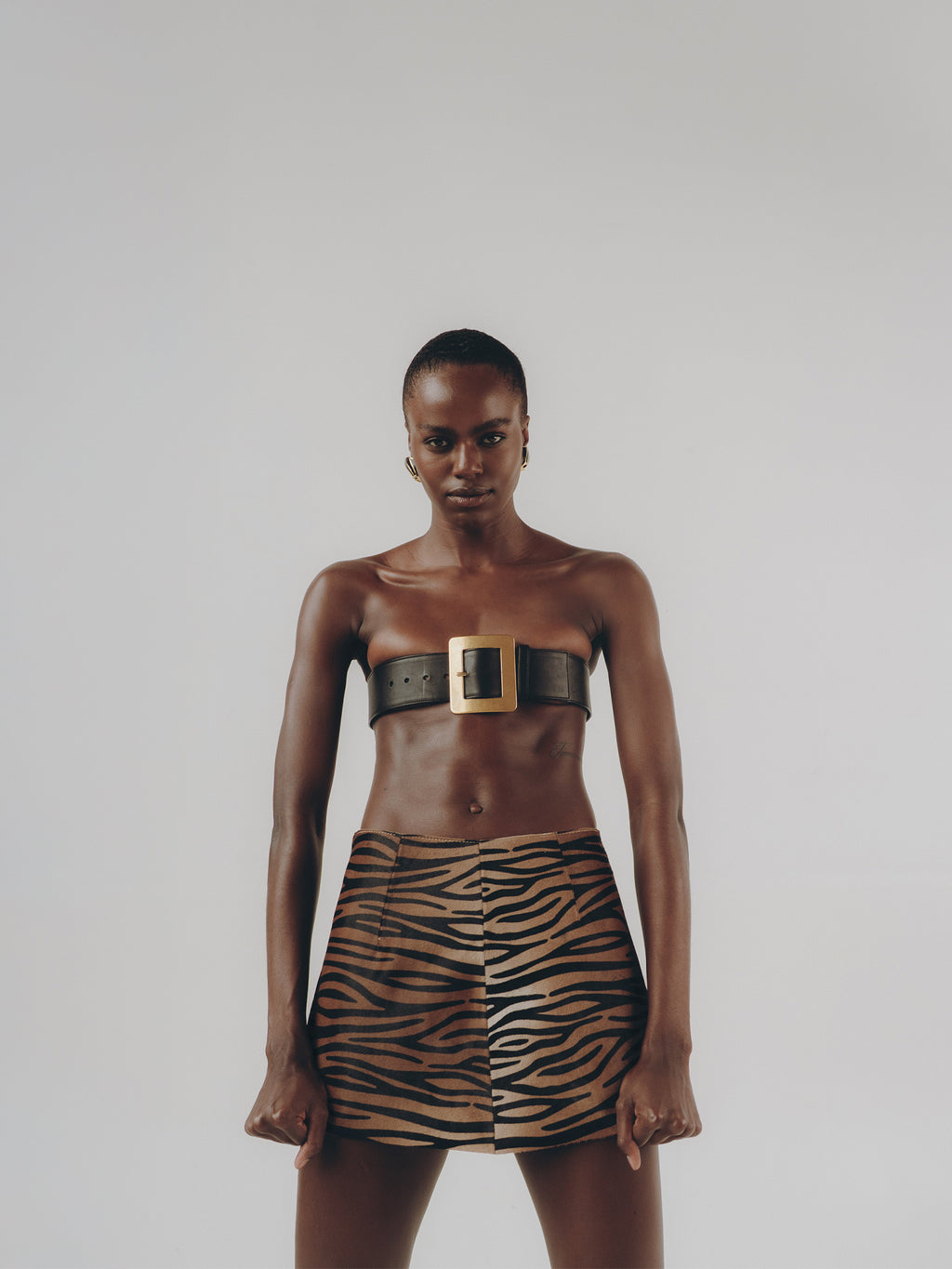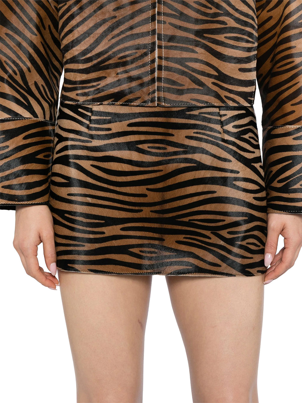 Zut's Tellier Skirt is crafted from honey zebra printed leather in a straight silhouette with a mid-rise fit. Designed to accentuate the waist while keeping a clean, structured line, it pairs effortlessly with the matching Tokyo Jacket for a cohesive statement look. -