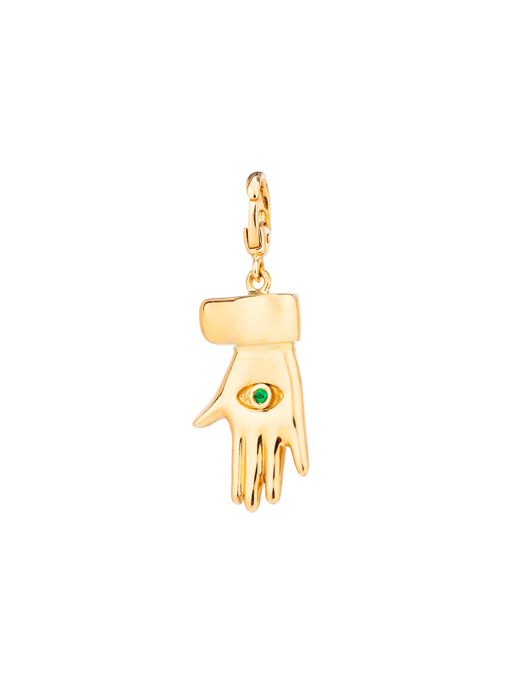 The Detachable Solid Hand Pendant with Emerald Eye, Sapphire and White Diamond by GuitaM is crafted in 18k yellow gold with intricate engraving. An emerald eye, sapphire, and white diamond bring vivid detail to the design, which can be clipped onto a favorite charm bracelet or necklace connector. A one-of-a-kind piece. -