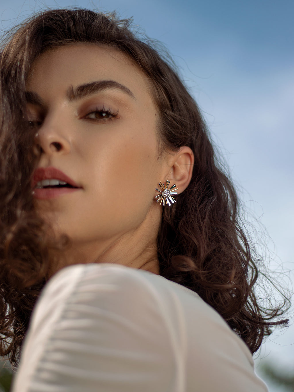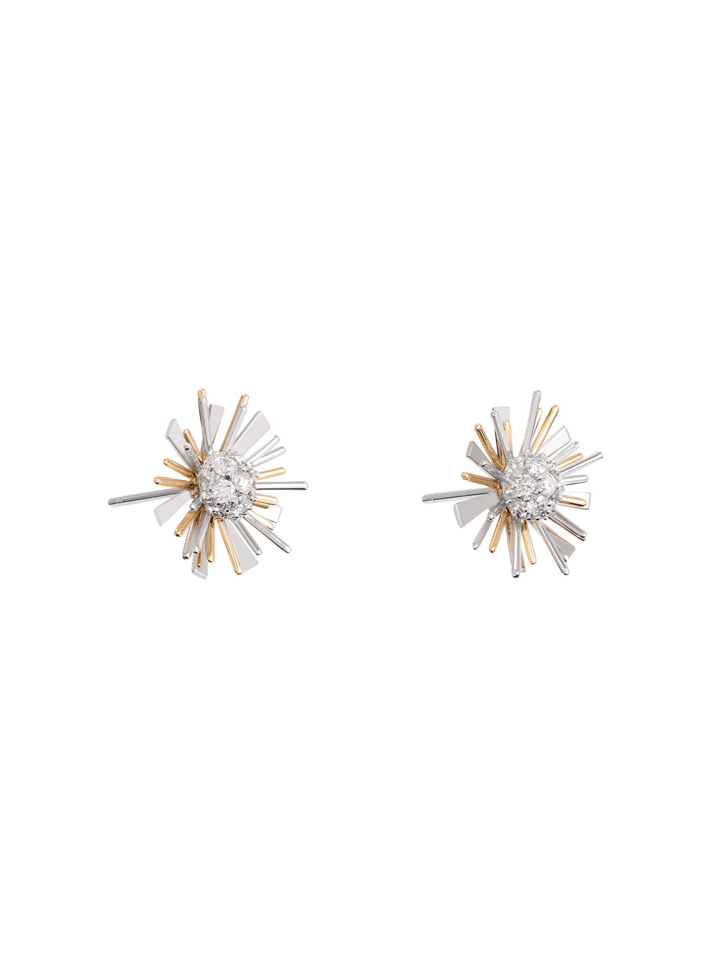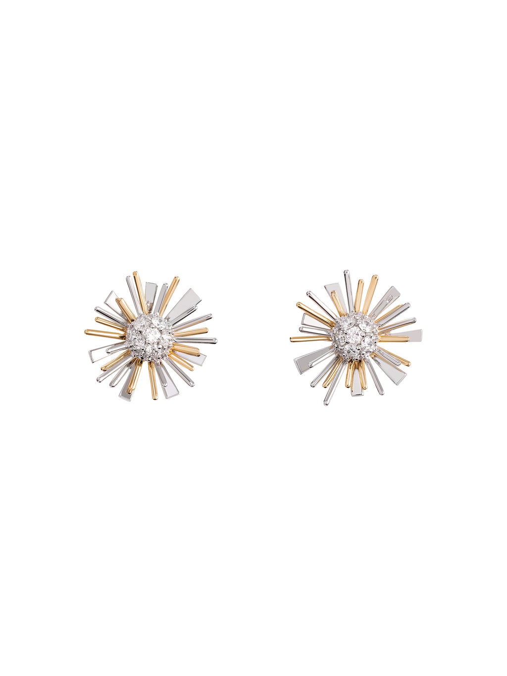 The Sunlight Earrings by Giovana Brait feature a two-toned design in white and yellow gold, crafted in a radiant sunburst silhouette with a diamond core. Part of the Sunrise Collection. This piece is ineligible for promotional discount. -
