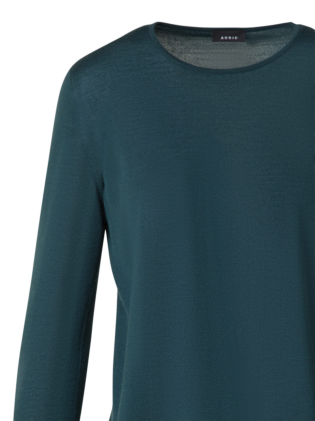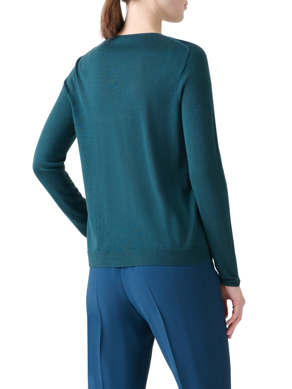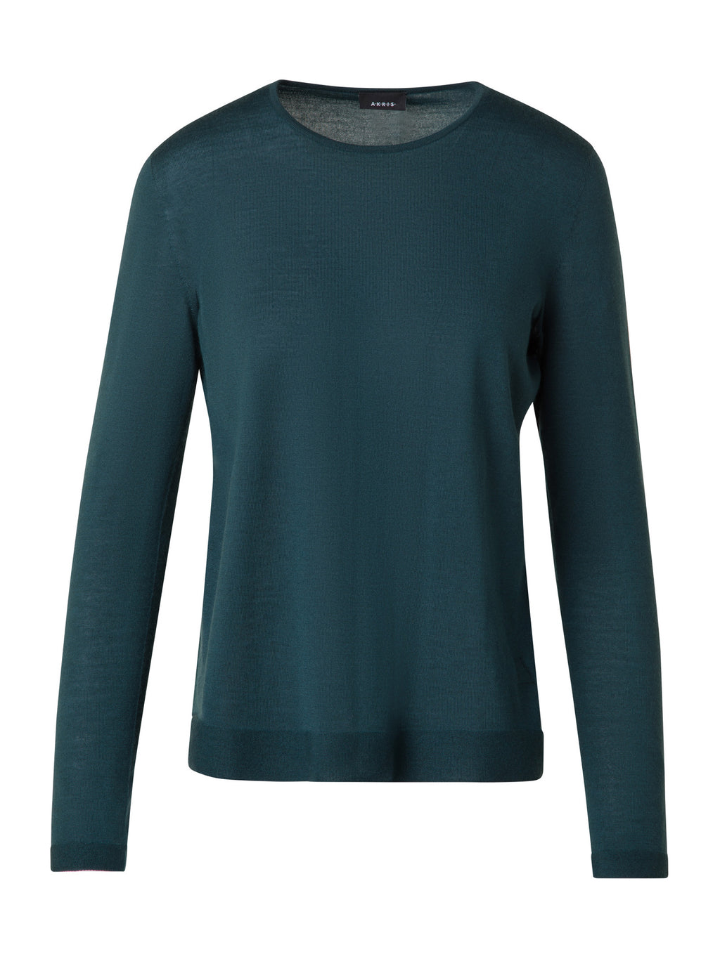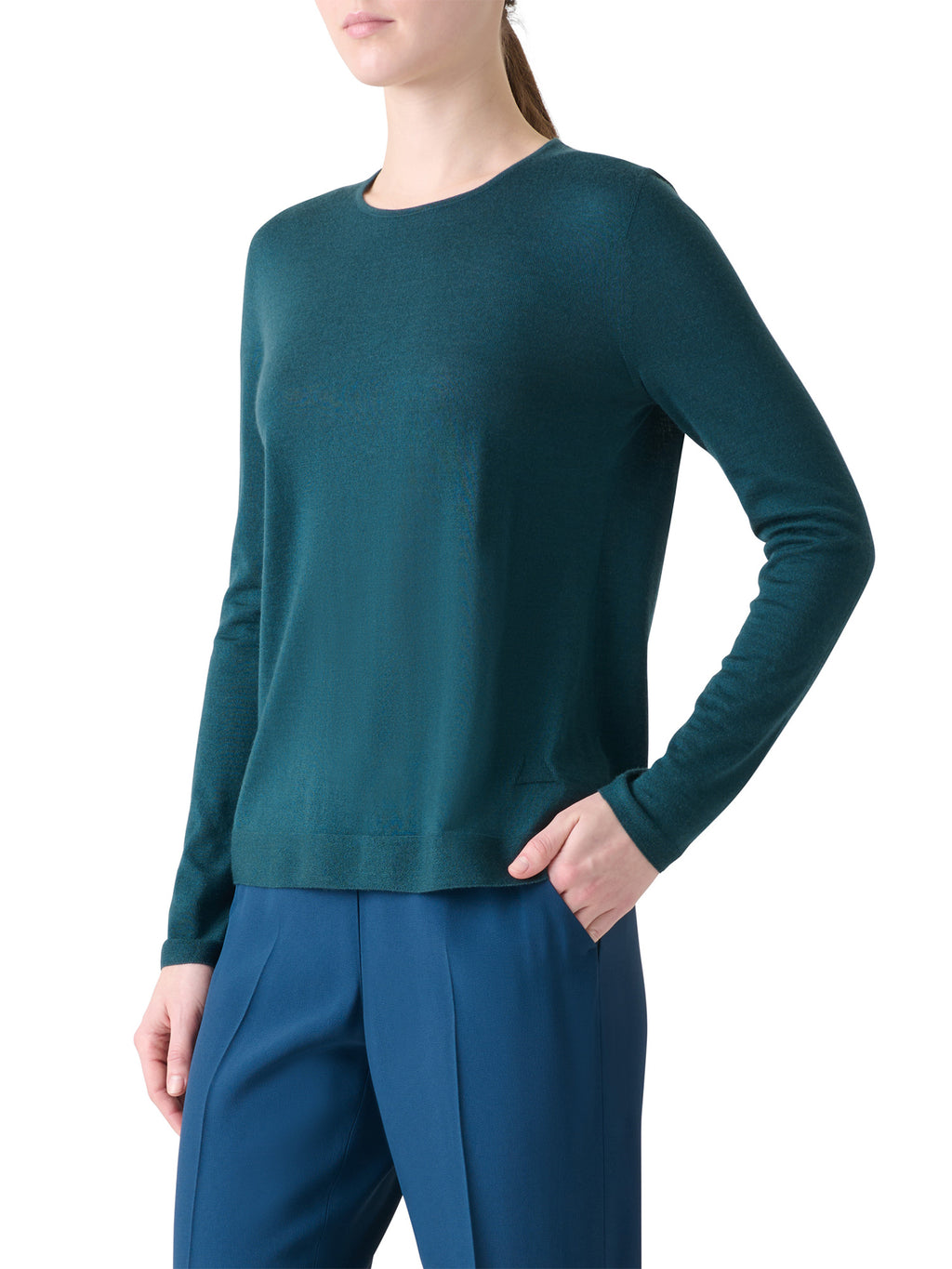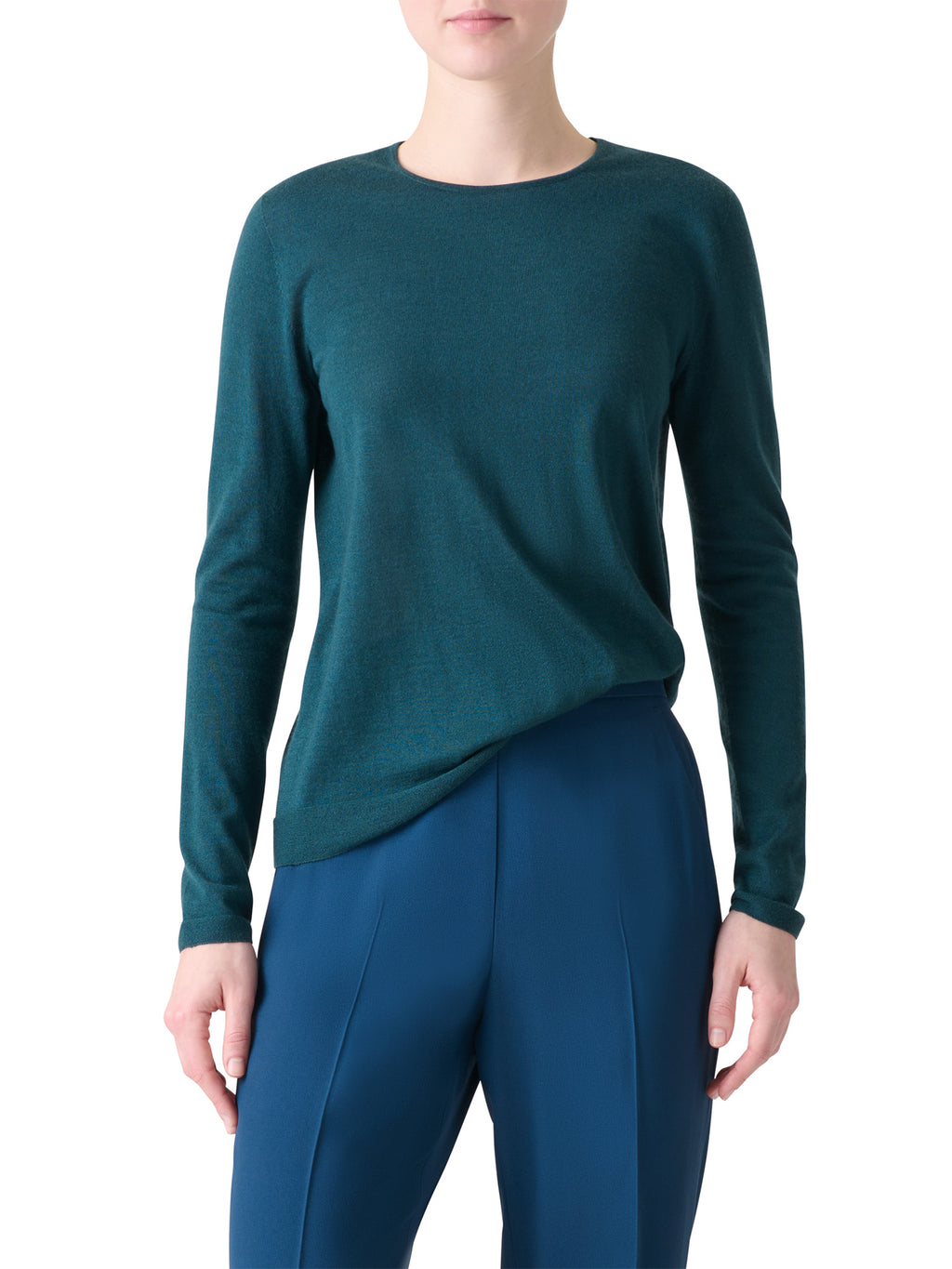 Akris’ Cashmere Silk Boat Neck Sweater is crafted from river green fine-gauge cashmere silk, featuring an elegant boat neck, seamless straight silhouette, and long sleeves. -