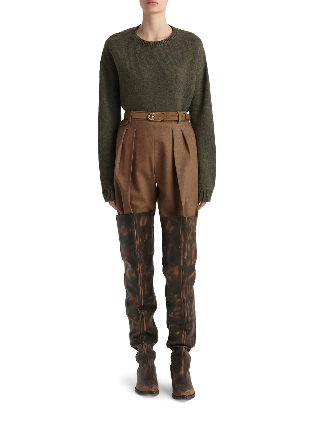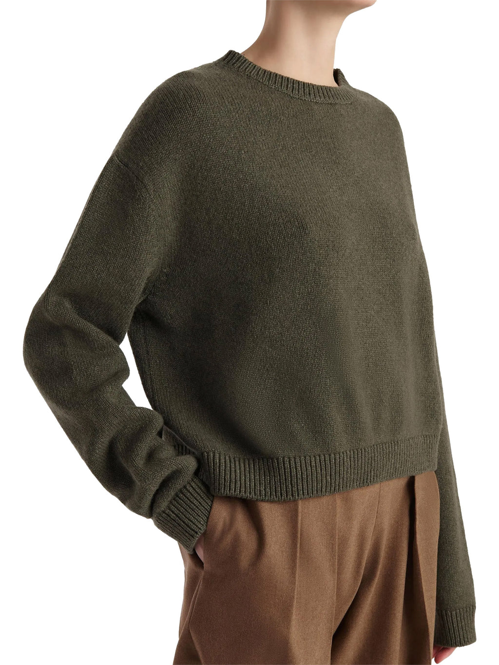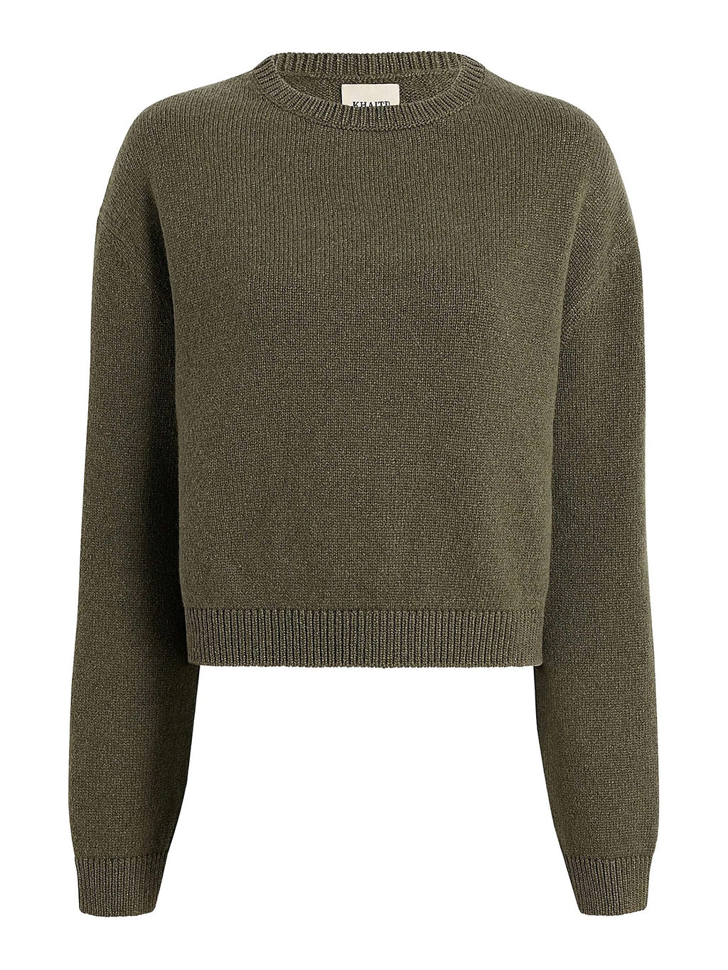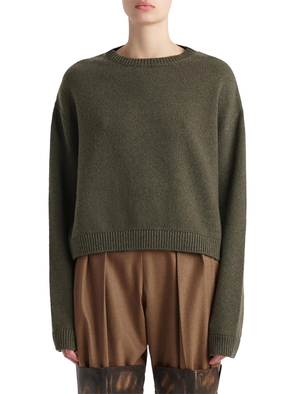 Khaite’s Milo Sweater is a drop-shoulder pullover crafted in cashmere chosen for its sleek surface and lofty feel. The jersey-stitch knit creates a fluid drape, while 1x1 ribbing at the crewneck, cuffs, and hem lends subtle definition. Relaxed yet refined, it’s a piece that moves easily between casual and polished settings. -