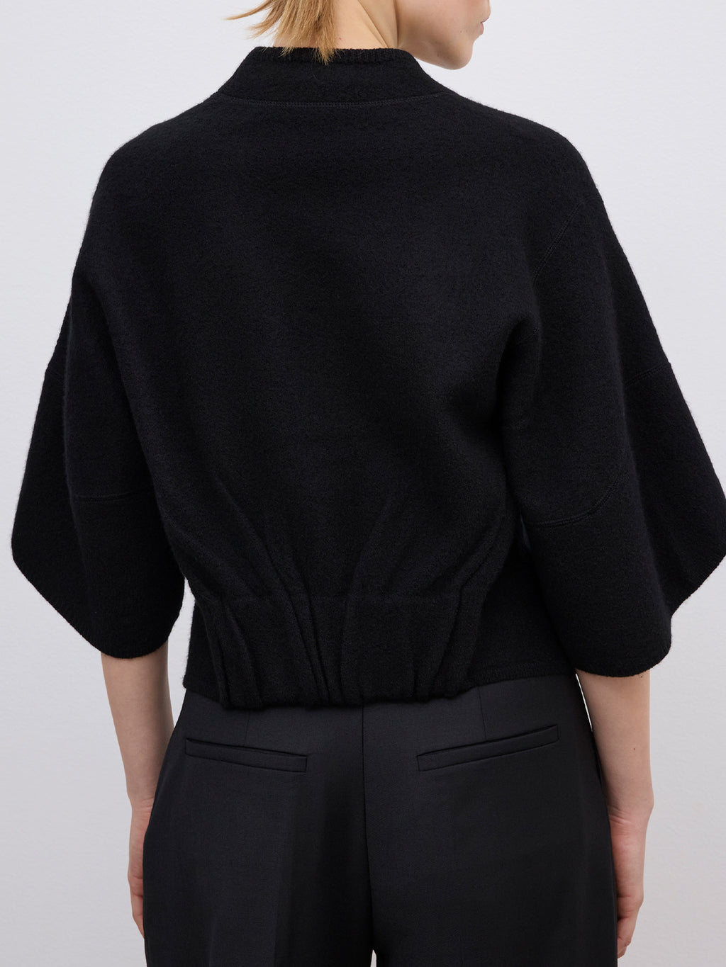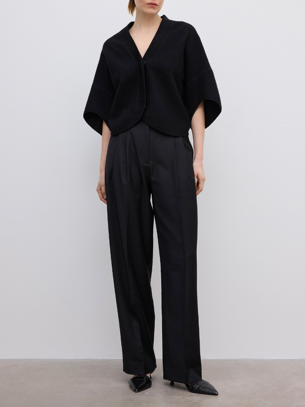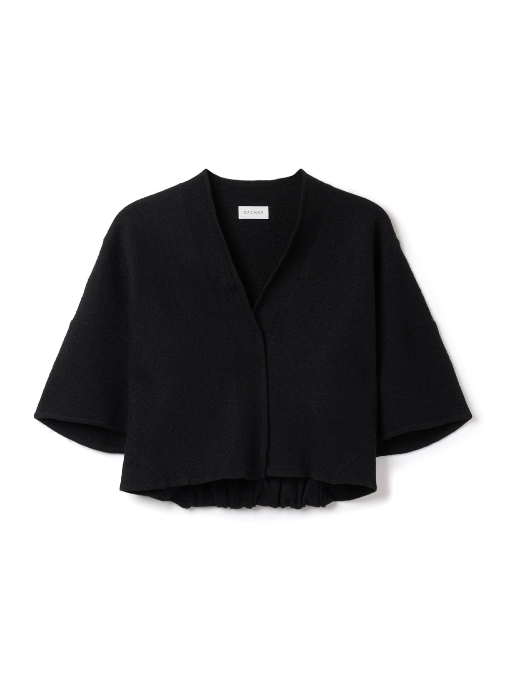 The Short Wool Bea Cardigan by House of Dagmar is a cropped V-neck in rigid, mulesing-free merino wool. It features rounded dropped shoulders and concealed front buttons, offering a modern, essential layering piece. -
