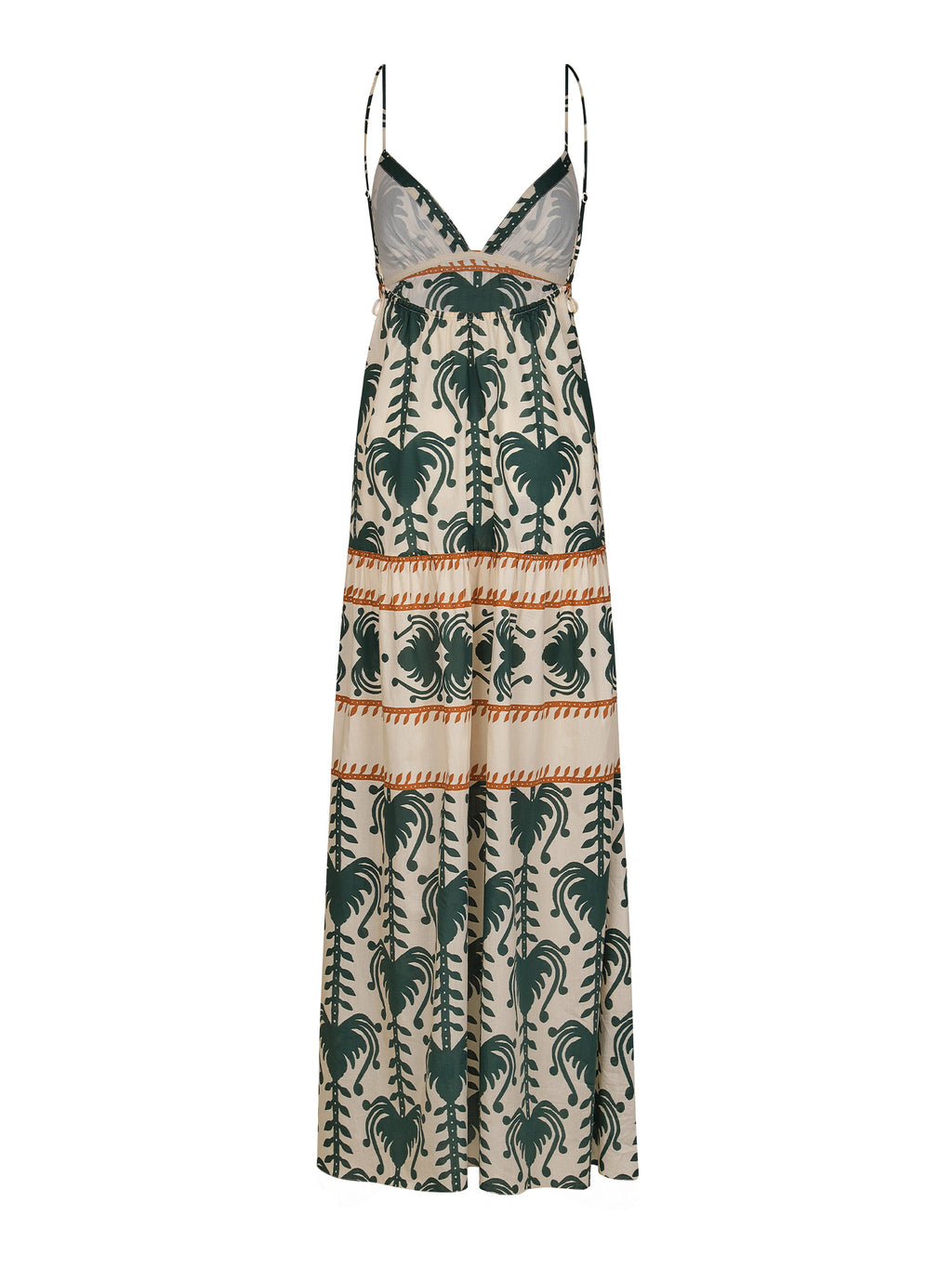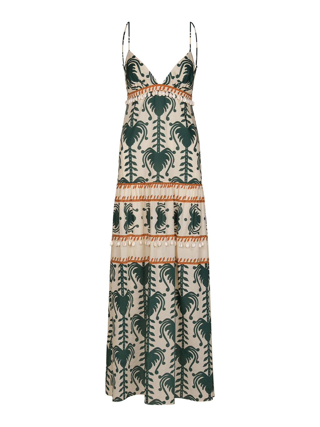 Johanna Ortiz’s Keeper Dress embodies easy summer romance in a strappy maxi silhouette cut from lightweight poplin. Rendered in ecru and green with the signature JO print, it features a plunging neckline, tiered skirt, and shell-trim detail at the waist. Effortless for warm-weather days, it styles seamlessly with flat sandals for daytime or heeled espadrilles. -