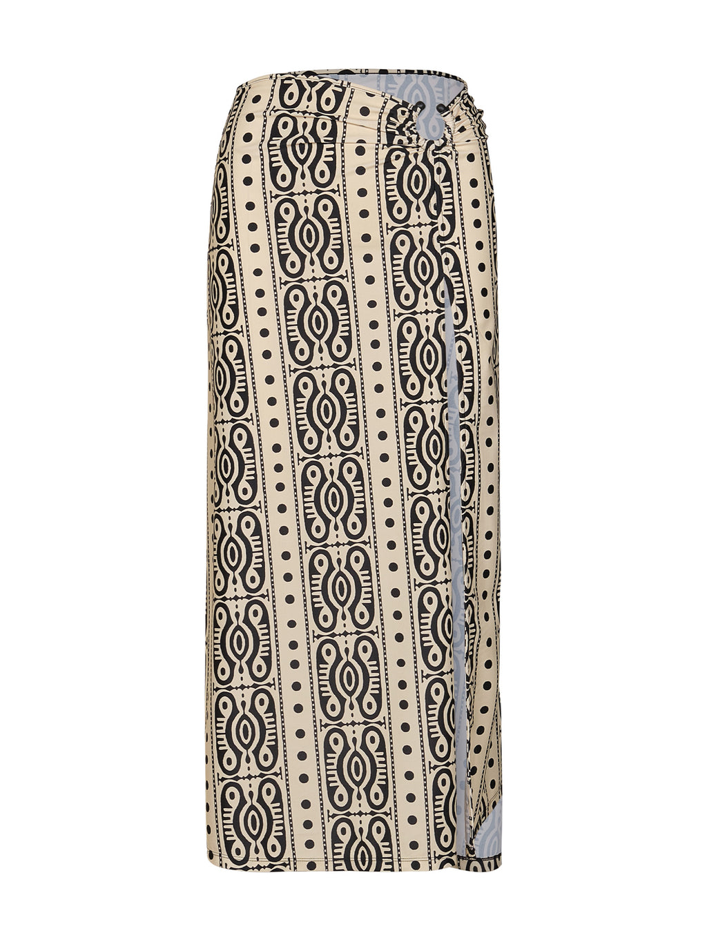 Johanna Ortiz’s Nuevo Destino Skirt channels the fluid, wanderlust energy of the JO Swim ’26 Whale Tail collection, inspired by the luminous waters and quiet beauty of Norman Cay in the Bahamas. In smooth printed Lycra, this classic silhouette skims the body with easy movement, creating a lightweight layer designed to complement the season’s swimwear. Shown here with the coordinating one-piece, you can also style with a breezy tunic and sandals for effortless beach-to-resort styling. -