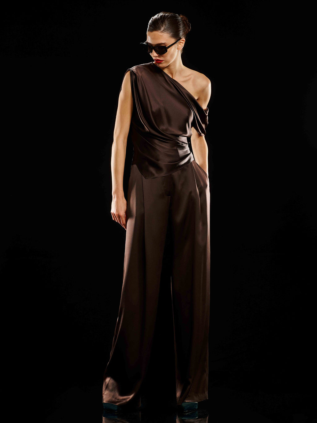 Cut in cocoa brown silk, the Asymmetric Drape Top by The Sei features a single-shoulder silhouette with soft, cascading drapes. Style with the matching Relaxed Silk Trousers for a coordinated look. -