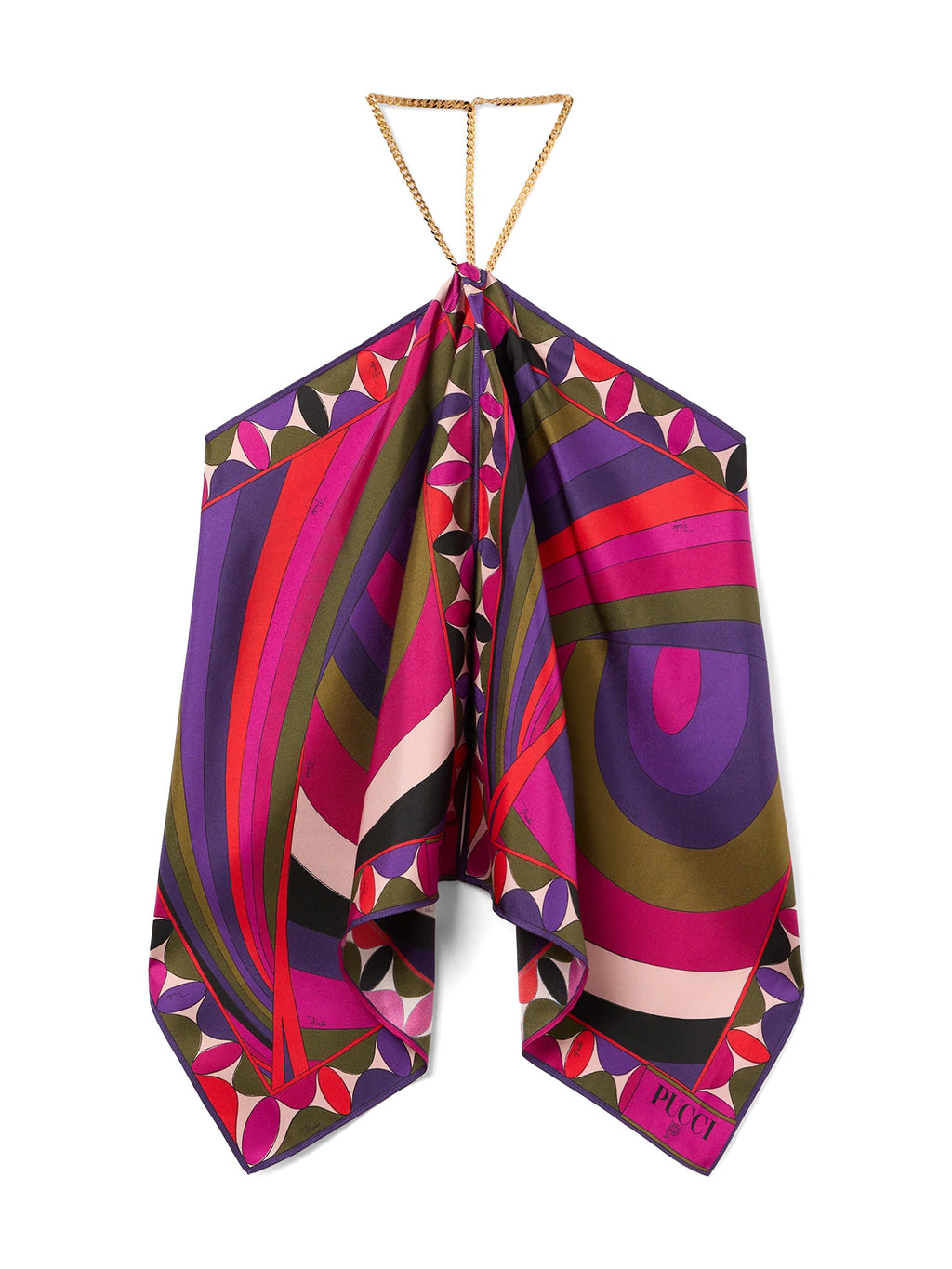 Pucci captures sensual ease with the Iride-Print Chain Top, crafted from fluid silk in the house’s signature swirling motif. The halter neckline drapes softly over the body, while a polished gold chain encircles the neck like jewelry, highlighting the shoulders and décolleté. With its luminous print and relaxed silhouette, this piece transitions effortlessly from day to night. Each top is unique, showcasing a one-of-a-kind placement of Pucci’s signature print.