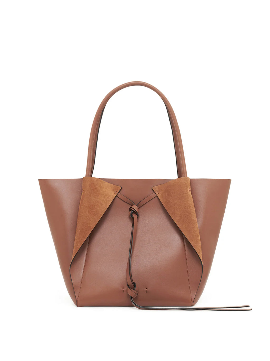 Gabriela Hearst’s Marija Tote, named for archaeologist Marija Gimbutas, is crafted in lamb leather with suede panels that fold like wings. Featuring a central knotted tie referencing spiral and snake motifs, it embodies strength and renewal. Showcased on the AW25 runway. Includes removable pouch. -