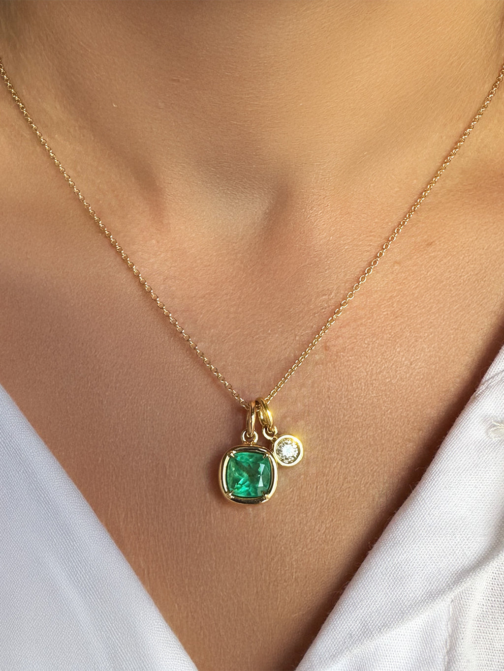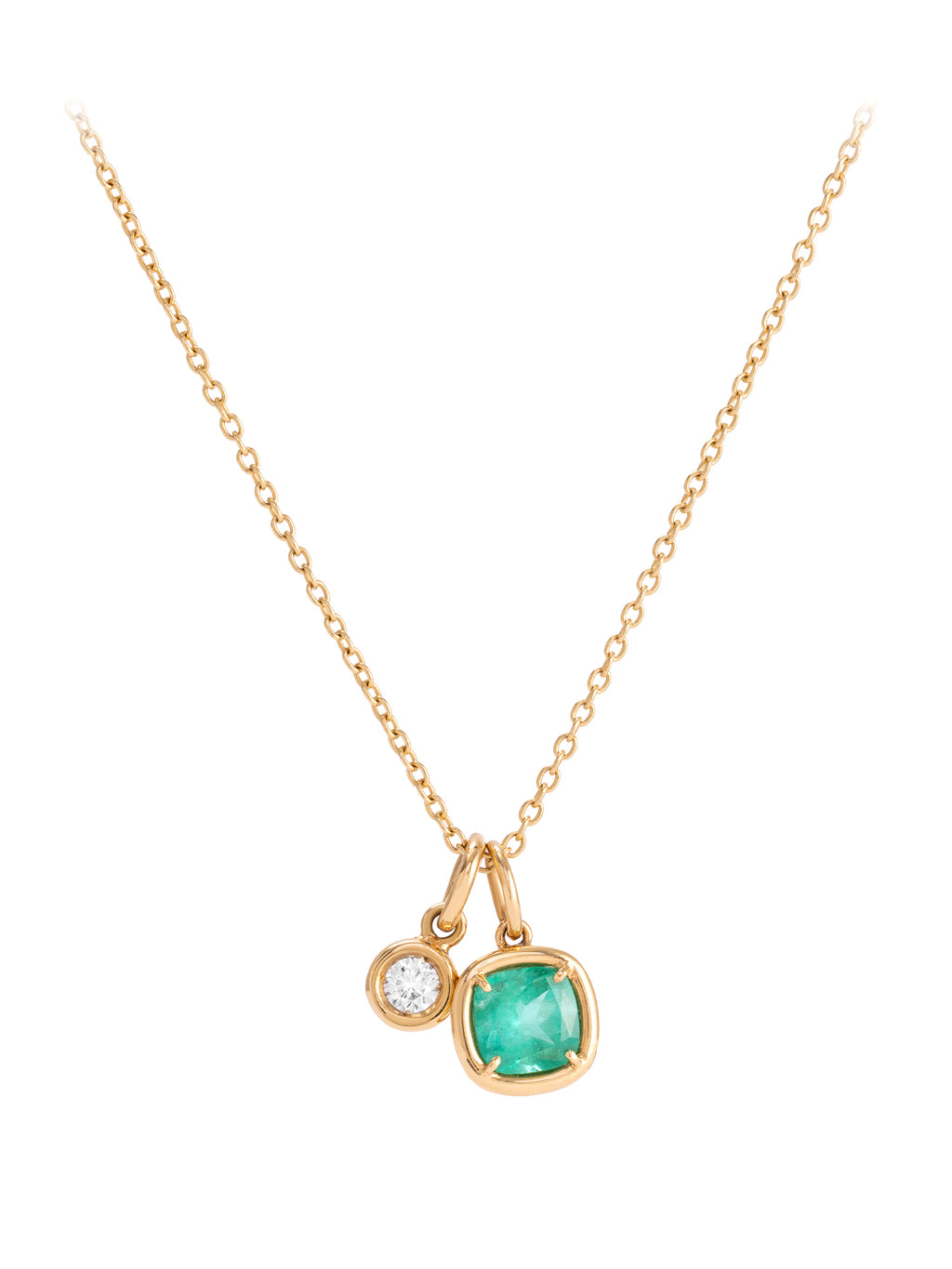 The Two-Pendant Necklace by Giovana Brait is crafted in 18k yellow gold, featuring two pendants: a cushion-cut emerald and a smaller diamond. Pairs perfectly with other pieces from the Bubble Collection. This piece is ineligible for promotional discount. -